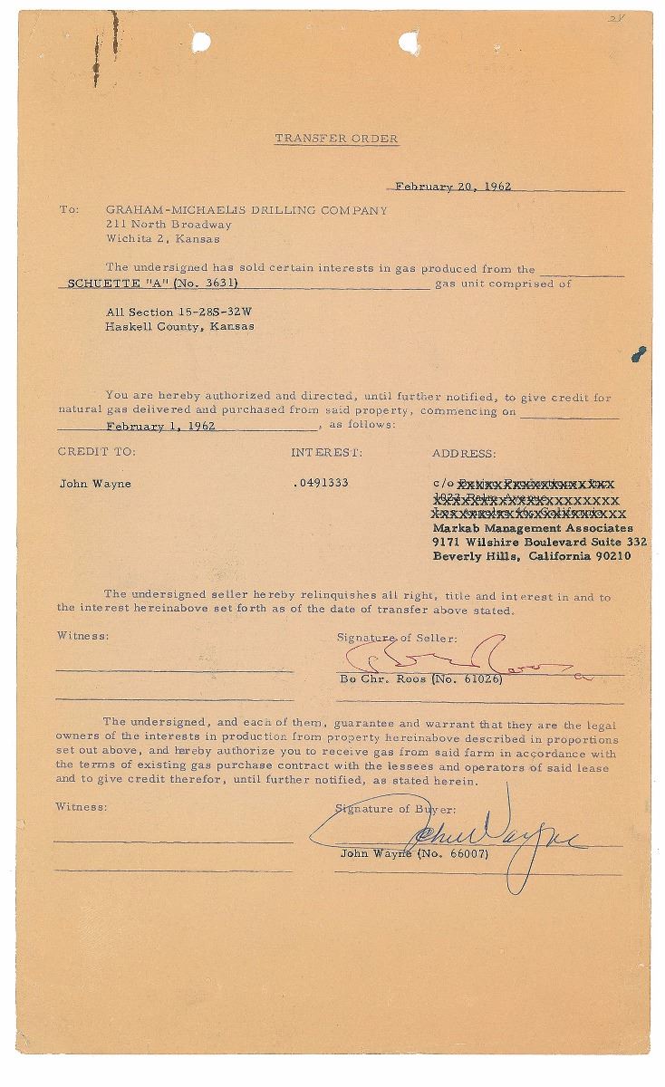 DS, one page, 8.5 x 14, February 20, 1962. Transfer order related to the purchase of “gas produced from the Schuette ‘A’ (No. 3631) gas unit comprised of All Section 15-28S-32W, Haskell County, Kansas.” Signed at the conclusion by Wayne as the buyer. In fine condition, with overall toning.