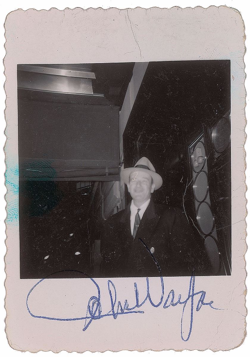 Exceptional vintage glossy 2.5 x 3.5 candid deckle-edge photo of Wayne in handsome formal attire, signed in the lower border in black ballpoint. Reverse bears a collector’s date notation of January 2, 1955. In fine condition, with some creasing, and a thumbprint mark to the left border.