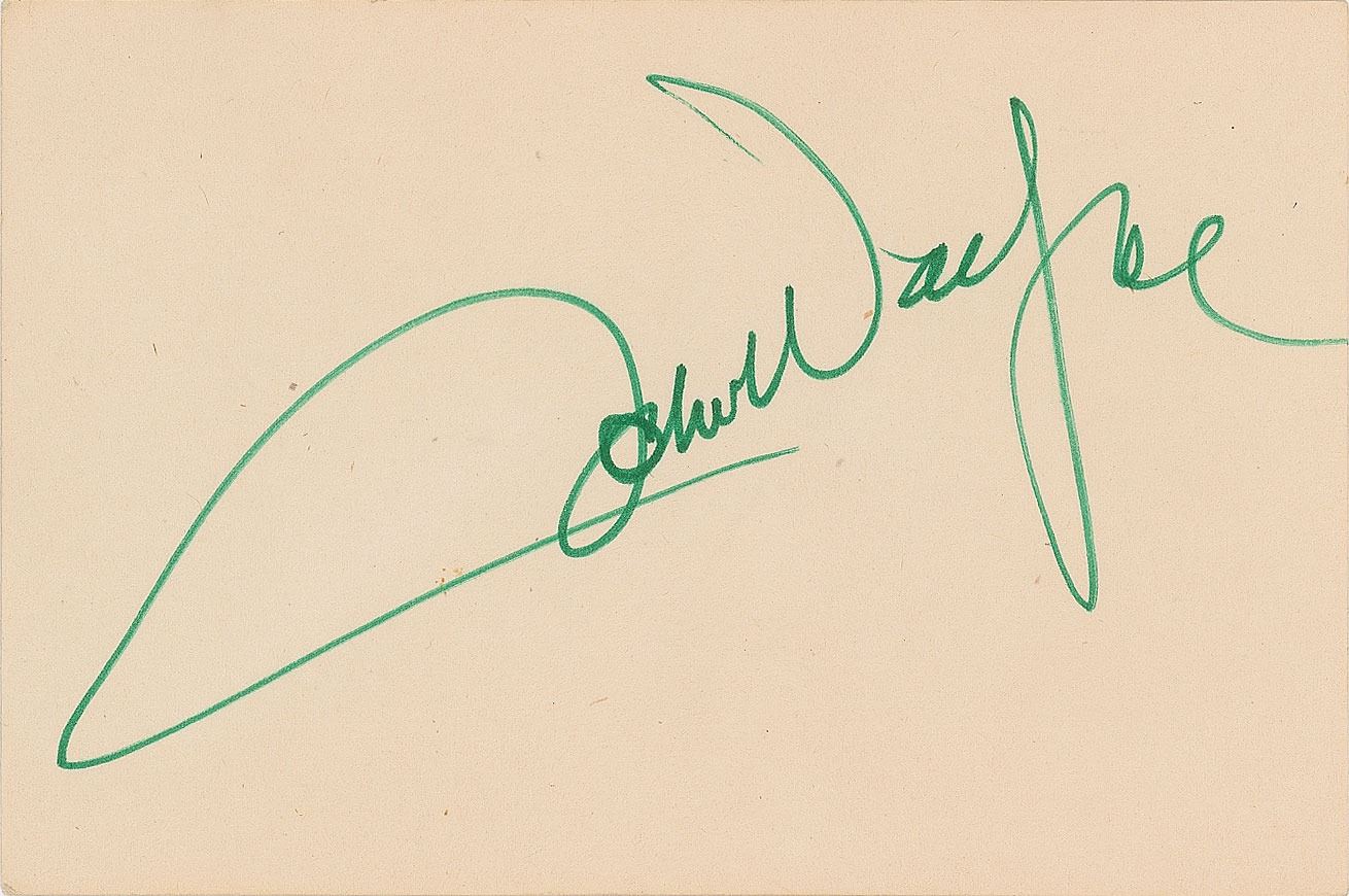 Large green felt tip signature, "John Wayne,” on an off-white 6 x 4 card. In fine condition, with mild uniform toning. From the Harvey and Rhoda Kuflik Collection.