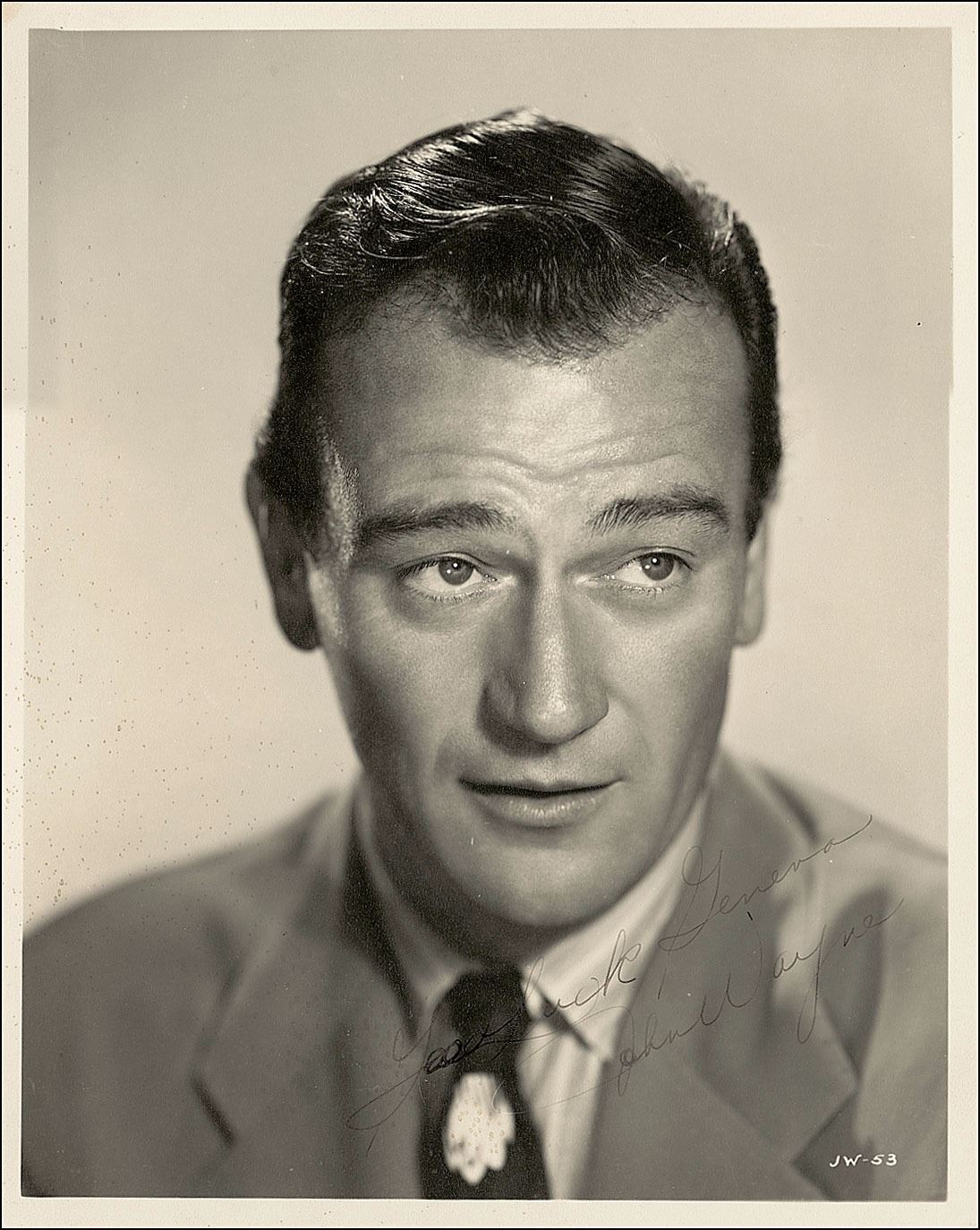 Vintage matte-finish 8 x 10 photo of Wayne, signed and inscribed in fountain pen, "Good luck Geneva, John Wayne." In fine condition, with some very faint and unobtrusive spotting to background; the writing is quite light but fully legible.