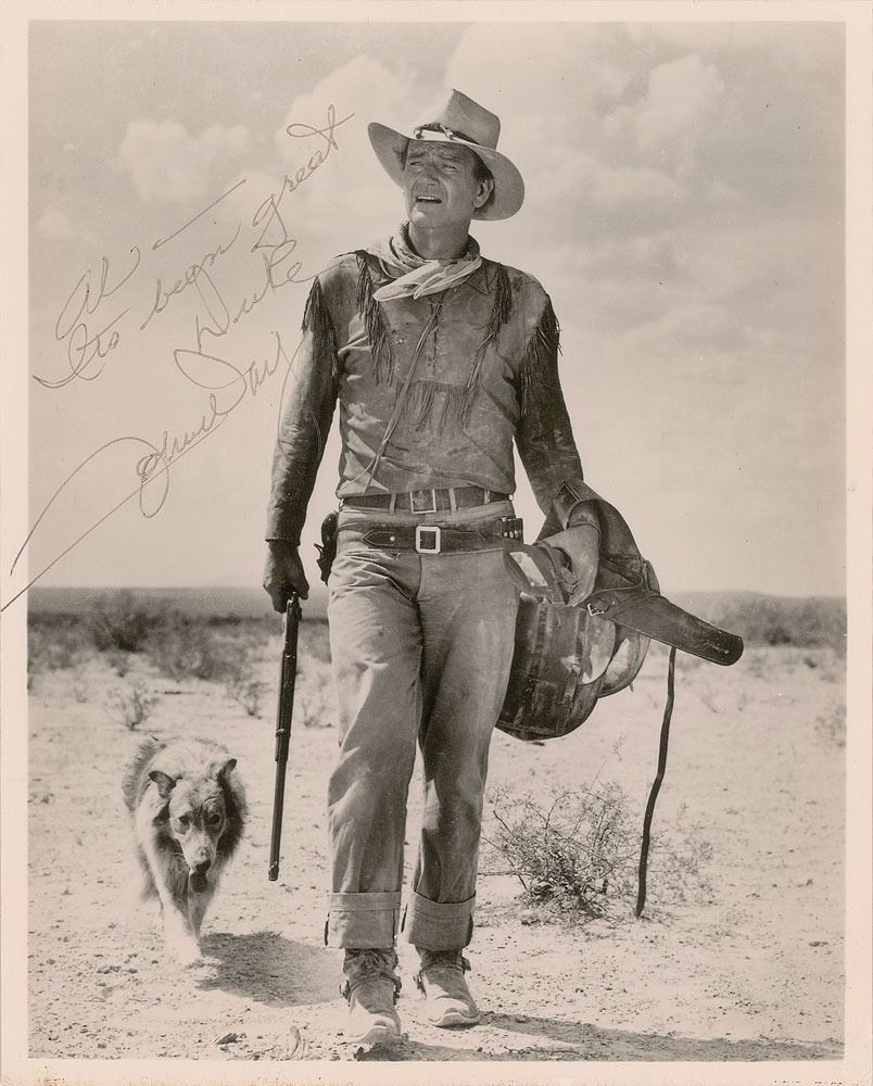 Fantastic vintage matte-finish 8 x 10 photo of Wayne as Hondo Lane in the 1953 classic Hondo, signed and inscribed in black ballpoint, "Al—Its been great, Duke, John Wayne.” In very fine condition. Accompanied by a full letter of authenticity from JSA. It is extremely uncommon to see Wayne sign with both "Duke" and his full name—an exemplary piece.