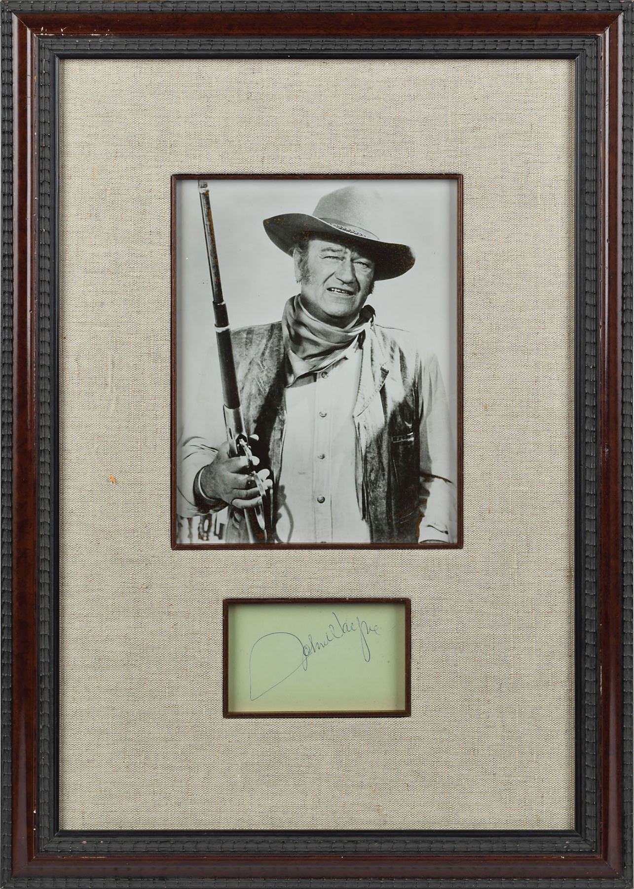 Vintage ballpoint signature, "John Wayne,” on an off-white 4.5 x 2.75 album page. Cloth-matted and framed with a photo of the Western star to an overall size of 16 x 23. In fine condition, with some skipping to Wayne's last name and flecks of golding to the included image.