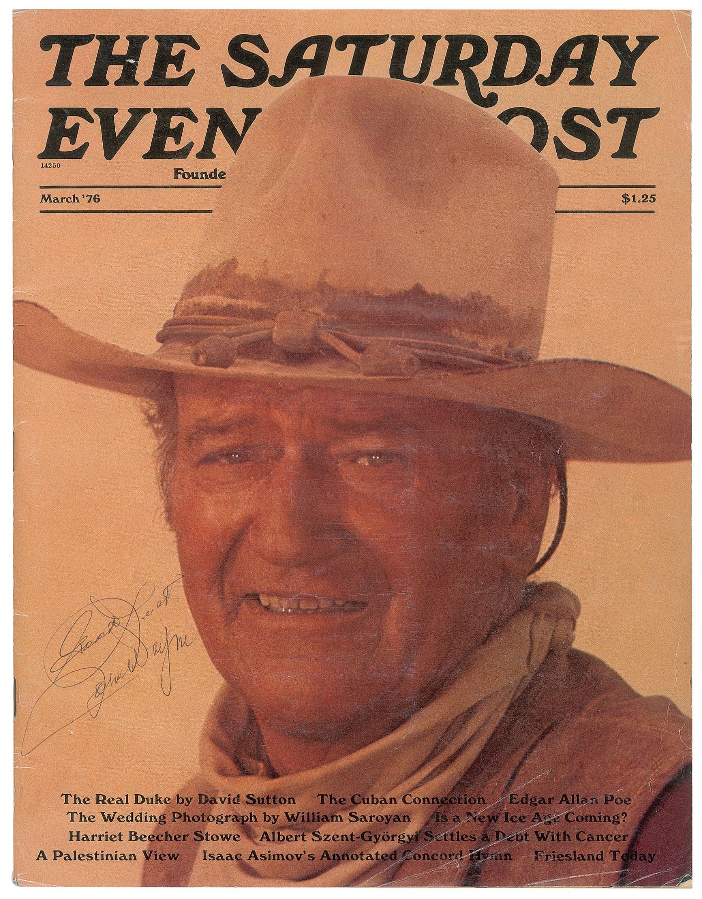 Saturday Evening Post magazine from March 1976, Vol. 248, No. 2., 120 pages, 10.25 x 13.25, signed on the front cover in black ballpoint, "Good Luck, John Wayne." In very good condition, with overall creasing, and two circular drinking glass impressions to Wayne's hat brim. Consignor notes that a friend had this magazine signed when the Duke visited her store in Newport Harbor, California.