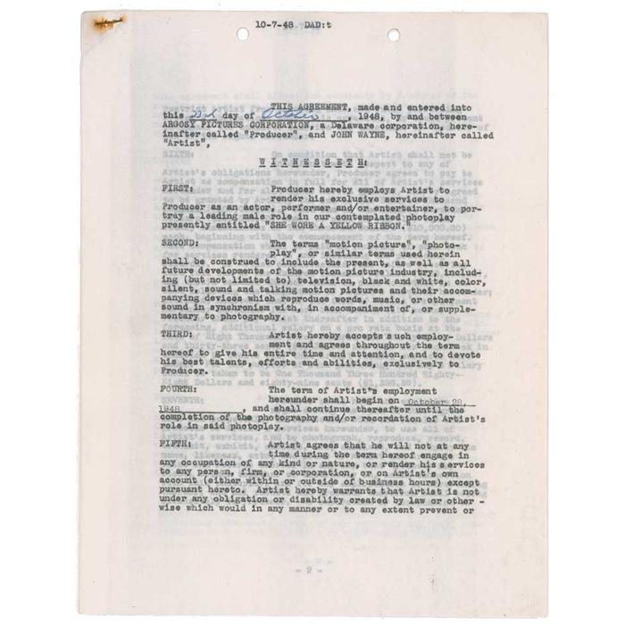 DS, twelve pages, 8.5 x 11, October 23, 1948. Agreement between Argosy Pictures Corporation and John Wayne for his performance in She Wore a Yellow Ribbon. The agreement details information regarding salary, costume, dubbing, credits, additional services to be rendered in conjunction with marketing the film, etc. Boldly signed in fountain pen on the last page by Wayne. In fine condition, with usual punch holes to top border, areas of the signature a shade light, and a rusted staple to upper left. Accompanied by a 2006 TLS from Harry Carey, Jr., regarding his working with Wayne, which reads, in part: “I had the good fortune to have made eleven movies with John Wayne…I once asked him what his favorite role was, thinking he would probably say The Searchers, but he didn’t. He said the role he was most proud of was that of Nathan Brittles in She Wore a Yellow Ribbon. He was very definite about that.”