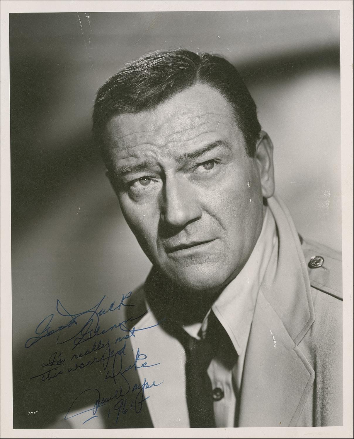 Vintage matte-finish 8 x 10 photo of Wayne in an overcoat, signed and inscribed in blue ballpoint “Good luck Glenn. I’m really not this worried. Duke, John Wayne 1961.” A few small spots of surface loss, a few light streaks through image, trivial rippling to top edge, and a couple edge dings, otherwise fine condition. According to the consignor, this photo originates from the Glenn ‘Frankenstein’ Strange estate. He met Wayne when he visited on the set of Gunsmoke in 1961, where Strange played a bartender on the show for years. An uncommon and desirable version of Wayne’s signature, as his adding ‘Duke’ was usually reserved for close friends and co-workers such as Strange.