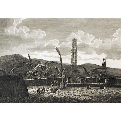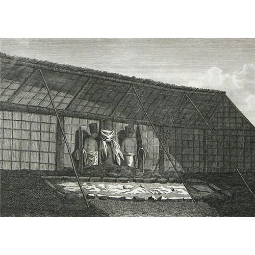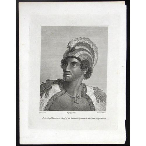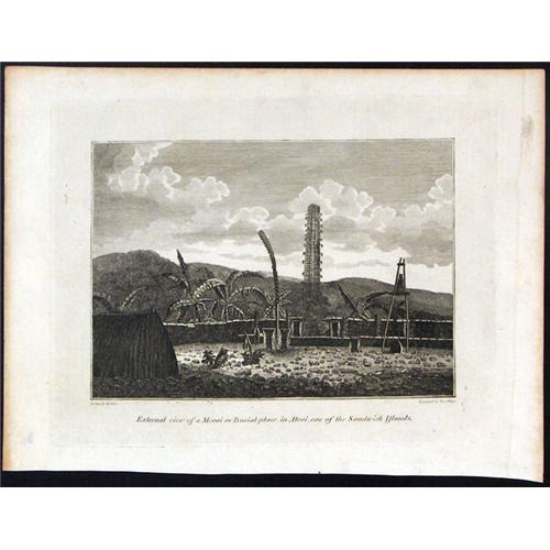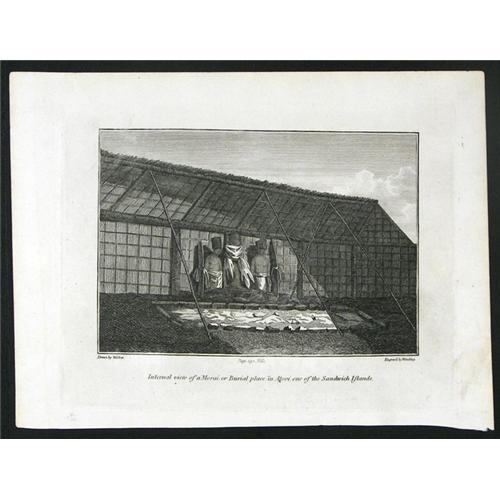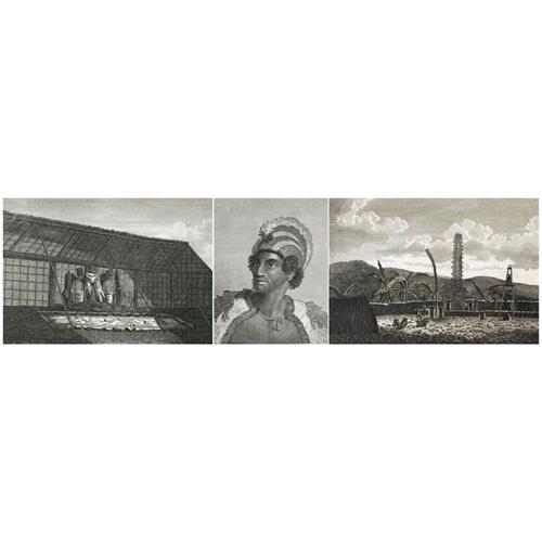 John Webber (1752-1793) 3 Bookplate Engravings from the 1st Edition of Cook's Voyages, "Internal View of a Morai or Burial Place in Atooi, One of the Sandwich Islands", image size 4 3/4" x 6 3/4", "Portrait of Kaneena, a Chief of the Sandwich Islands in the North Pacific Ocean", image size 6 1/8" x 4 3/4", "External View of a Morai or Burial Place in Atooi, One of the Sandwich Islands", image size 4 3/4" x 6 3/4"