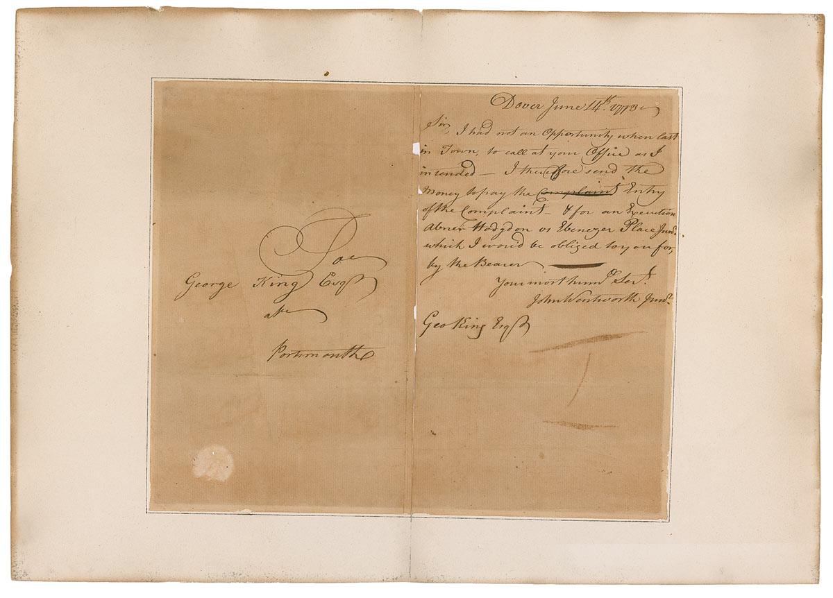 Lawyer (1745-1787) who served as a delegate to the Continental Congress for New Hampshire and a signer of the Articles of Confederation. ALS signed “John Wentworth, Jnr,” one page on two adjoining sheets, 4.25 x 7.25, June 14, 1773. Wentworth contacts George King of Portsmouth. In part: “I had not an opportunity when last in town to call at your office as I intended—I therefore send the money to pay the entry of the complaint.” Professionally inlaid into a larger page. In very good condition, with mild toning, soiling, and a complete split along the hinge of the adjacent address panel, and a circular area of thin paper to the adjacent panel.