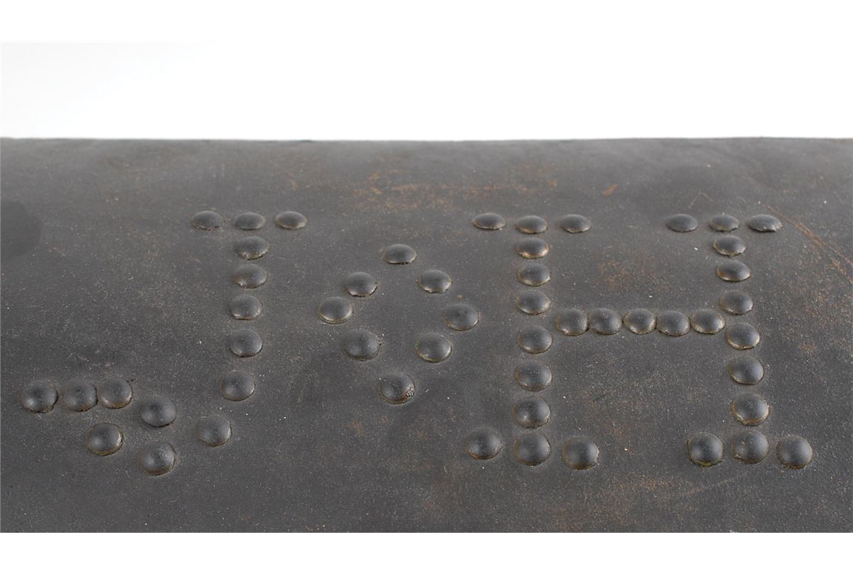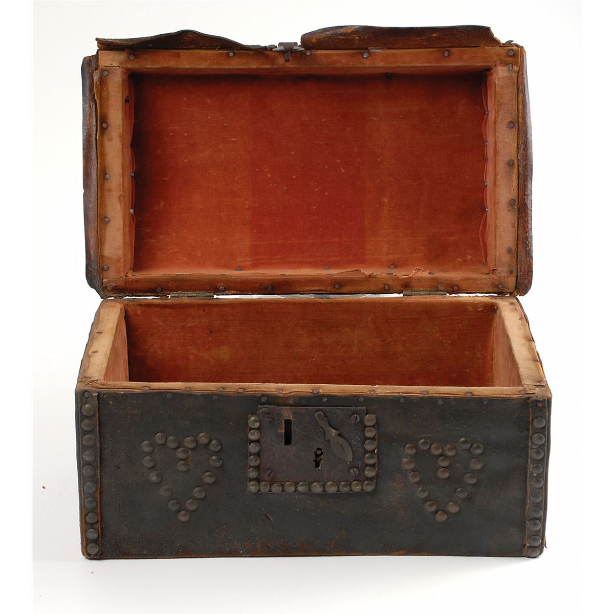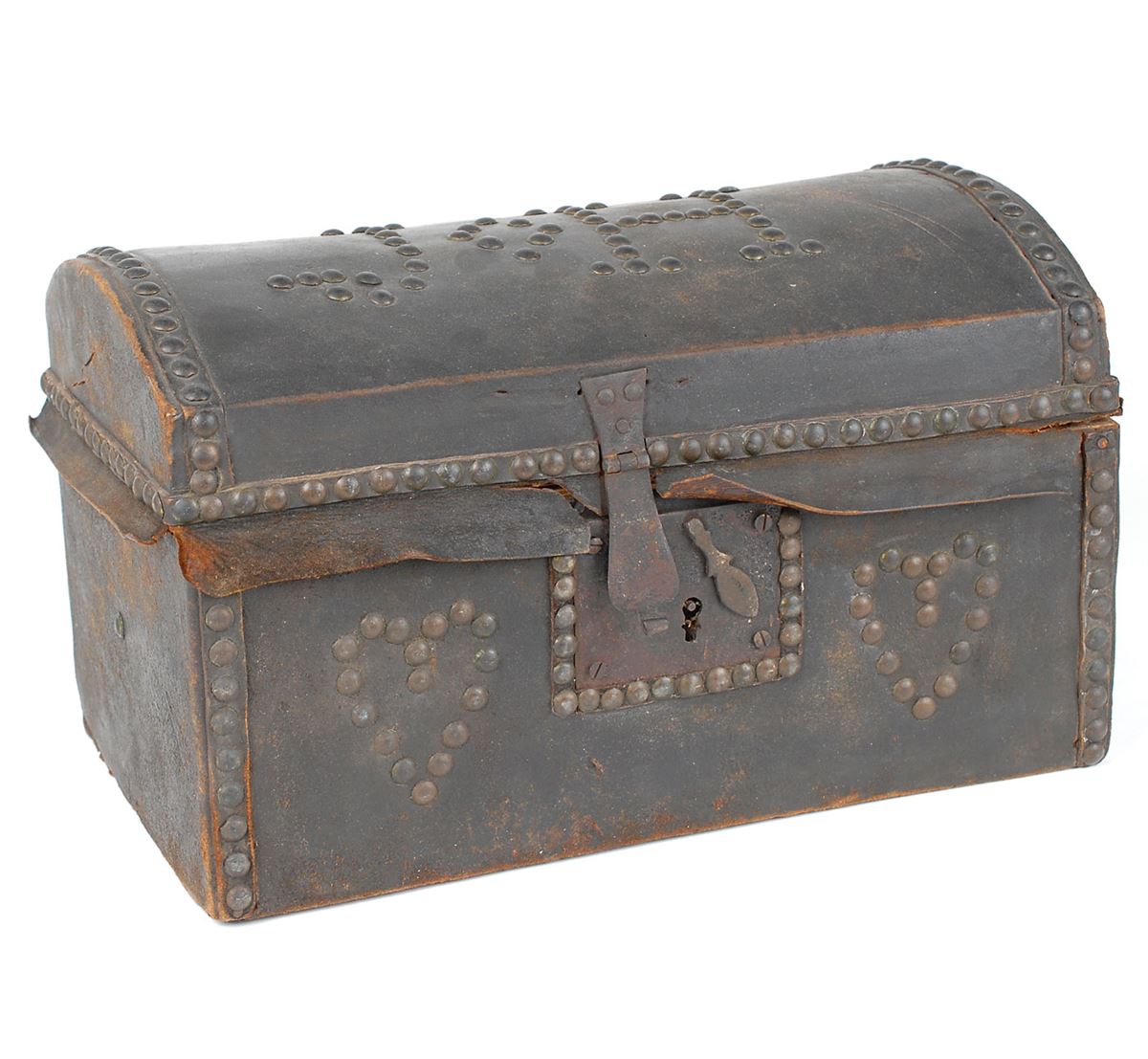 John Wesley Hardin’s rawhide stagecoach trunk, 14 x 8.5 x 8.5, constructed of wood with brown rawhide tacked to the exterior and a soft cloth lining the interior. The top of the trunk is tacked with his initials, “JH,” separated by a diamond design, and the front is tacked to form two hearts and a rectangle surrounding the locking metal latch. General expected wear, otherwise fine condition. Originates from the Dan Hardesty Wild West Museum collection.