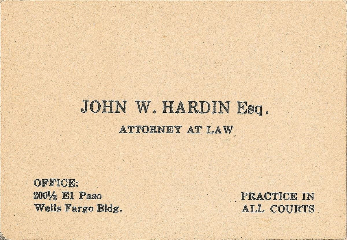 Old West outlaw, gunfighter, and folk icon (1853–1895). Hardin’s simple business card, 3 x 2, imprinted with black text: “John W. Hardin Esq., Attorney at Law. Office: 200 1/2 El Paso, Wells Fargo Bldg. Practice in all courts.” Affixed to a letter of authenticity from Robert E. McNellis, certifying that the card came from Hardin’s estate and was originally purchased from his great nephew Joe Hardin Clements. In fine condition.