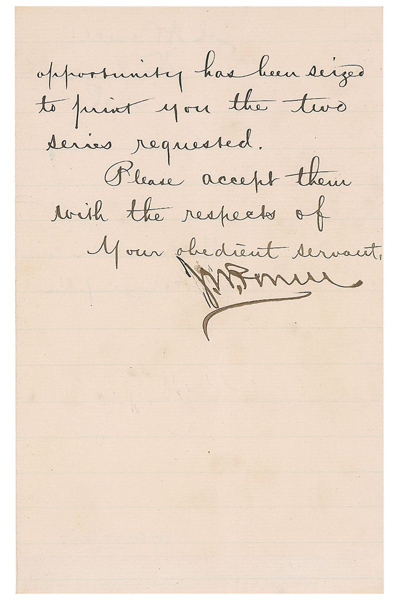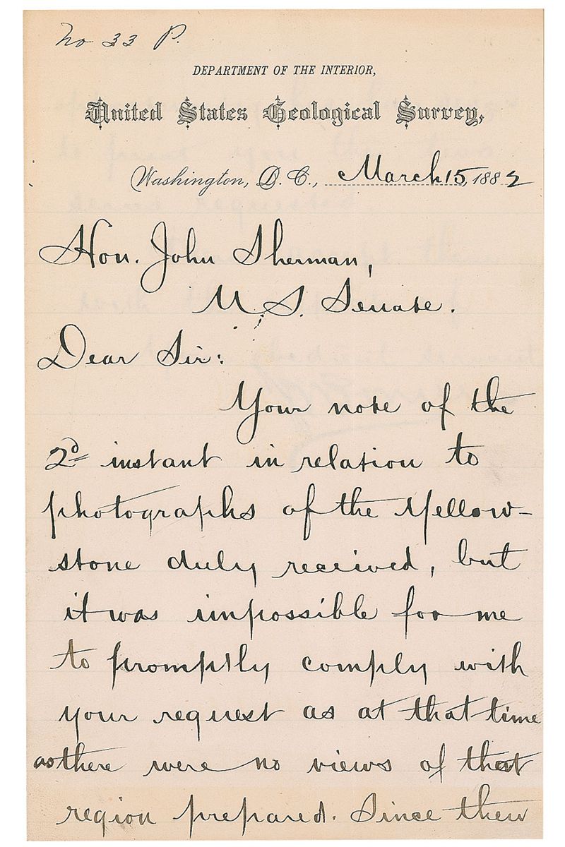 American soldier, explorer, and geologist (1834–1902). After serving as a major in the Union Army and sustaining a severe injury to his arm at Shiloh, Powell led a number of expeditions to the American west, including the first organized passage through the Grand Canyon. He later headed the US Geological Survey and the Bureau of Ethnology at the Smithsonian Institution. LS signed “J. W. Powell,” two pages, lightly-lined on two adjoining sheets, 5 x 7.75, US Geological Survey letterhead, March 15, 1882. Letter to Senator John Sherman. In part: “In relation to photographs of the Yellowtone…there were no views of that region prepared. Since then the opportunity has been seized to print you the two series requested.” In fine condition, with unobtrusive intersecting folds (the vertical fold passing through a single letter of the signature). Accompanied by an unsigned carte-de-visite portrait.