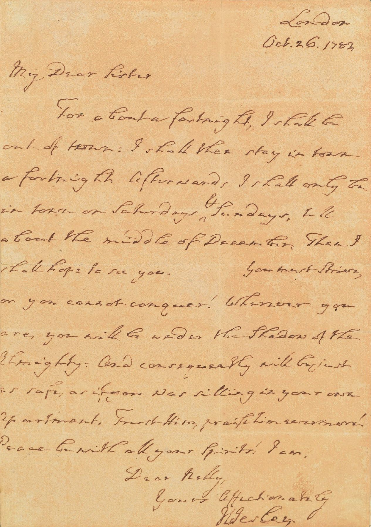 This is one of a scant few Wesley autographs we have encountered, and it is the very first letter—the others have been mere clipped signatures. Wesley wrote to many women, and the address as 'Sister' (as in this letter), was not uncommon. This letter may have been written to Ellen Gretton, to whom there are other extant Wesley letters from the same time, also addressed as both 'Sister' and 'Nelly.' After joining a Methodist society and given public addresses, Gretton married William Christian of Skillington on February 25, 1783. A supremely desirable example from one of the most important ministers of the 18th century.
