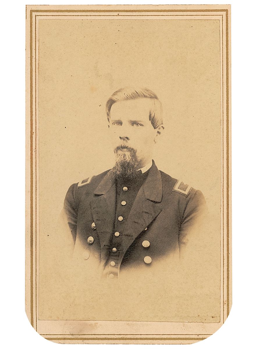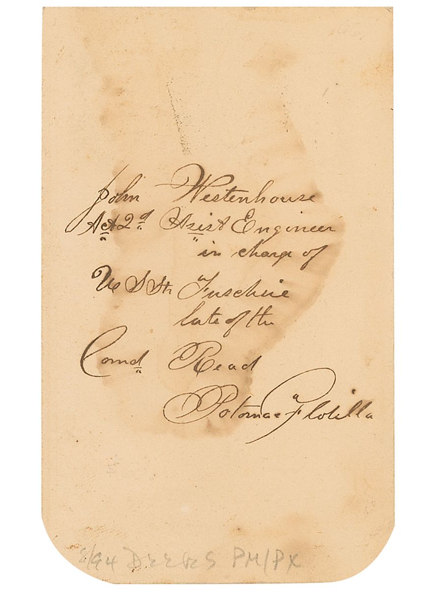 Union naval officer. Original 2.25 x 4 carte-de-visite photo by an anonymous studio, signed on the reverse in black ink, “John Westenhouse, Act 2d asist Engineer in charge of U. S. Str Fuschise late of the Comd Read, Potomac Flotilla.” In very good condition, with clipped bottom corner tips, and dampstaining over signature.