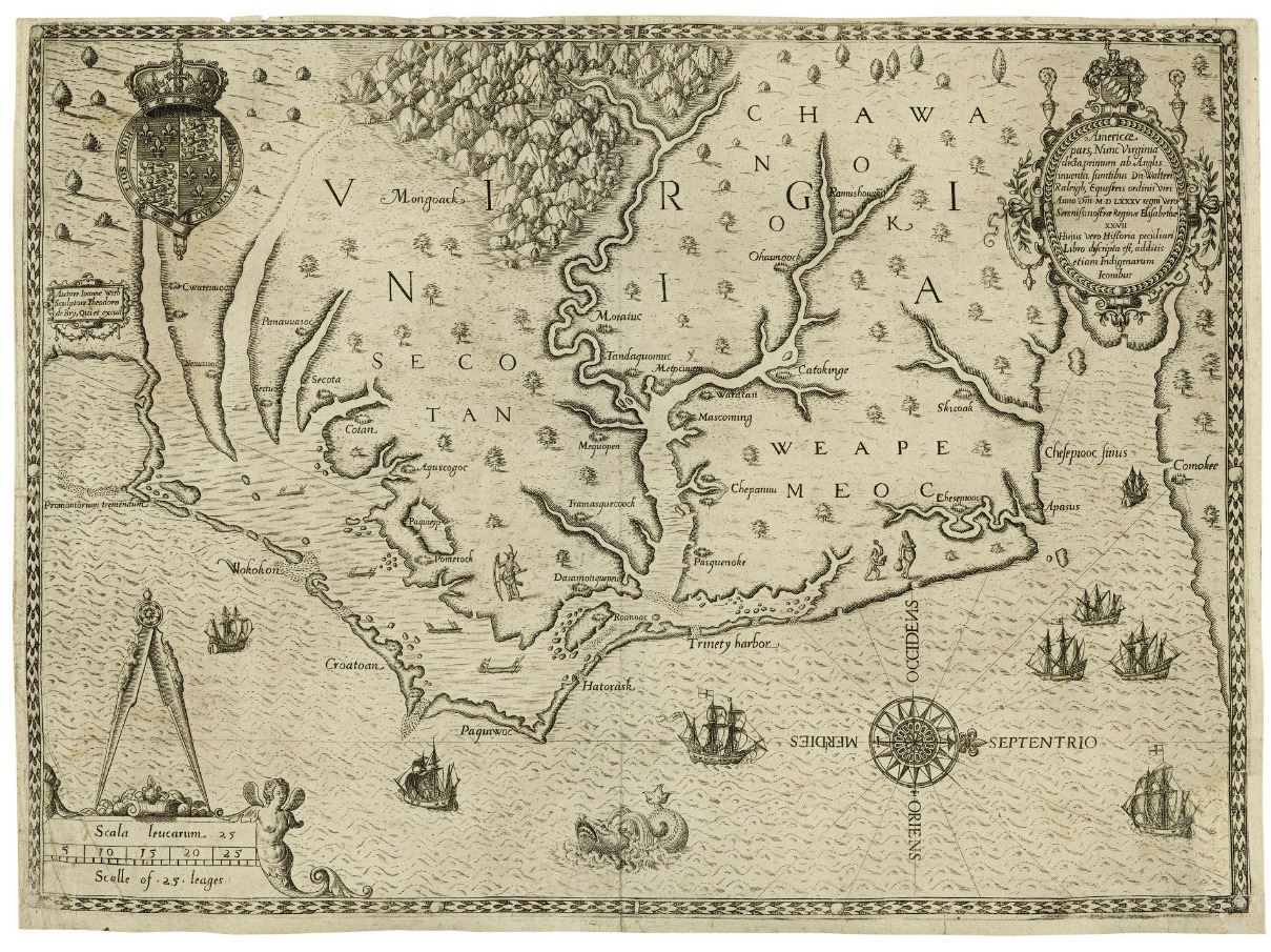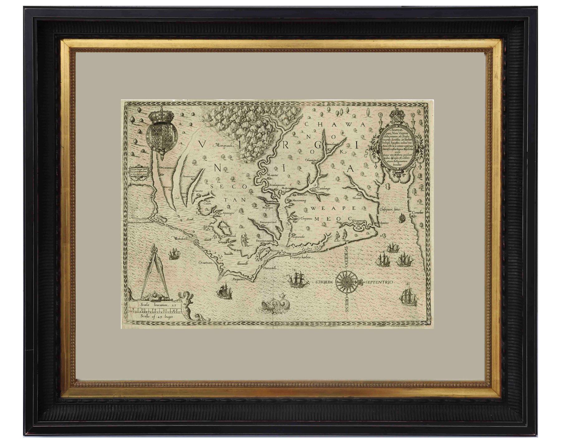 An important 16th century North American map known not only for its level of detail and accuracy, but also for its ''firsts'': the first printed map of Virginia and North Carolina, the first to use Virginia in its title, the first to name the Chesapeake Bay, and also the first regional map showing the Roanoke Colony. Frankfurt: Theodor de Bry (engraver) for inclusion in his ''Anglorum in Virginiam aduentus'', 1590.
