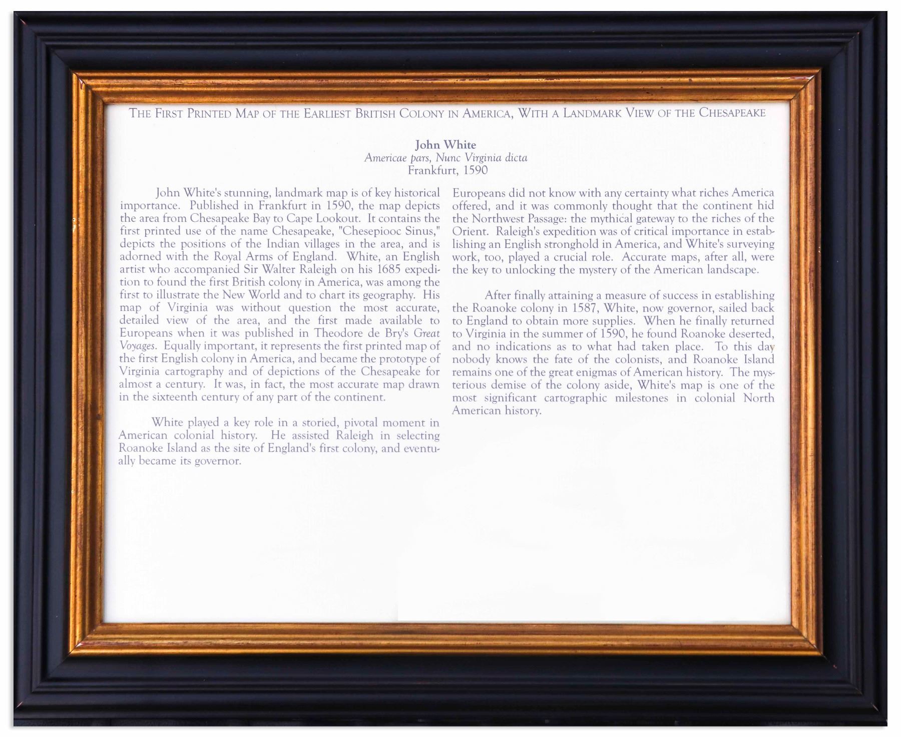 Map is based on the work of cartographer, artist and explorer John White, one of the first settlers and Governor of the Roanoke Colony who, after sailing back to the Colony from England in 1587, had found all the colonists famously missing, their fate a mystery still unsolved. Philip Burden, who wrote the definitive reference book, ''The Mapping of North America'', wrote of this map: ''One of the most significant cartographical milestones in colonial North American history...the most accurate map drawn in the sixteenth century of any part of that continent.''
