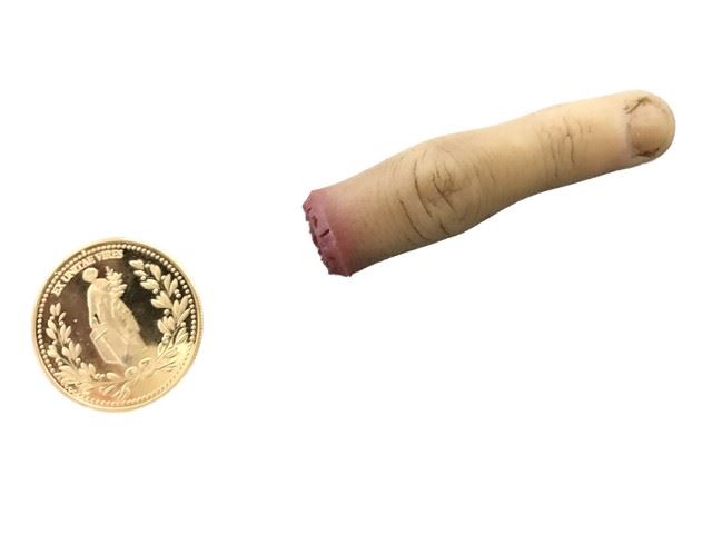 John Wick: Chapter 3 (2019) - Gold coin and severed finger. Gold plated metal coin measures approximately 1 1/2" diameter. Severed finger measures 3" long.
