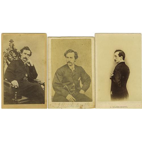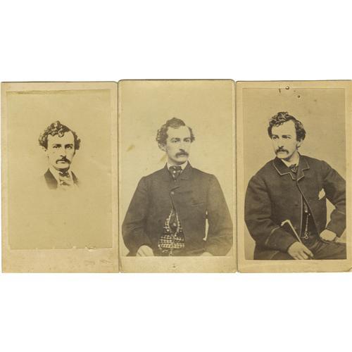 <B>John Wilkes Booth: An Outstanding Collection of Ten <I>Cartes de Visite.</B></I></B></I> <BR>--An unusual image by an unidentified maker. Shows his left profile from hips up, holding his right hand across his chest. Printed name below. Excellent-mint. <BR>--Another uncommon pose by an unnamed maker. Shows him seated, from knees up with right arm resting on a fringed support, and fingers at his chin. Paper loss across bottom of image. <BR>--Another unusual seated image by Joseph Ward, Boston. His coat is buttoned at the top but then hangs open at the waist to reveal a patterned vest. Excellent but for a couple of minor small stain marks. <BR>--A small image of Booth's head only, full face. Also by an unnamed maker. Excellent. <BR>--A standing Booth in elegant topcoat. Name printed below. Revenue stamp, but no maker on reverse. Very good, with center horizontal crease. <BR>--Two seated images showing him holding his walking stick in right hand. Both show his exposed patterned vest above waist. Neither is identified as to maker, but the larger is imprinted on Reverse "J. Wilkes Booth, Murderer of Abraham Lincoln". The latter grades excellent, the former very good. <BR>--Another, similar, but the exposed vest is of a solid color and his watch chain hangs in the center. No maker. Very good-excellent. <BR>--Two seated images in an ornate Victorian chair. The first is by E.H. McKinney, Riddford, Maine and in an unusual black and white tone. Second is by an unnamed maker and is in very good-excellent condition. The former example is excellent but for slight trimming and a small stain in the bottom border. <BR>Each approximately 2.5" x 4"<BR><BR><b>Shipping:</b> Small Flat (<a target="_blank" href="http://www.heritageauctions.com/common/shipping.php">view shipping information</a>)