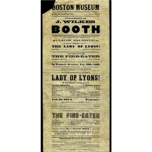 John Wilkes Booth. Theatrical broadside, Jan. 20, 1863, appearing in "Lady of Lyons" at Boston Museum. 6 x 15. Booth's name, in bold type, printed three times. Small 1 x 1 3/4 piece lacking at top left corner, affecting one letter, else fine.