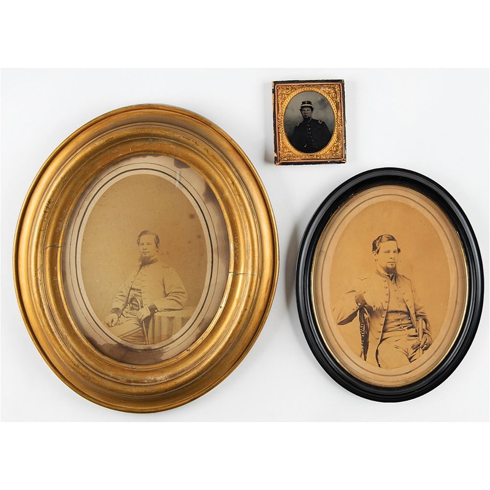Uncommon grouping of photographs of Captain George Weest of the 95th Regiment, Pennsylvania Volunteer Infantry, highlighted by a fine, half-cased sixth-plate-size tintype (3.25" x 3.75") of Weest in his officer's uniform, showing him seated and looking into the camera. Weest wears a nine-button Veteran Reserve Corps officer's frock coat with 1st Lieutenant's shoulder straps. Also included are two oval albumen photographs of Weest in his Veteran Reserve Corps uniform, both measuring about 5" x 7", framed in period, oval wooden frames to overall sizes of 8" x 10" and 11.5" x 13.5". Lastly, a small framed 1901 printed statement by Weest on the disposition of "The Body of J. Wilkes Booth," along with an original carte-de-visite photo of Booth by Selby & Dulany are included. In very good to fine condition, with some staining to the mount of the larger oval portrait, and clipped top corners to the Booth carte-de-visite. Weest's commission as first lieutenant in Co. G of the 95th Regiment is also present, but split into eight pieces.