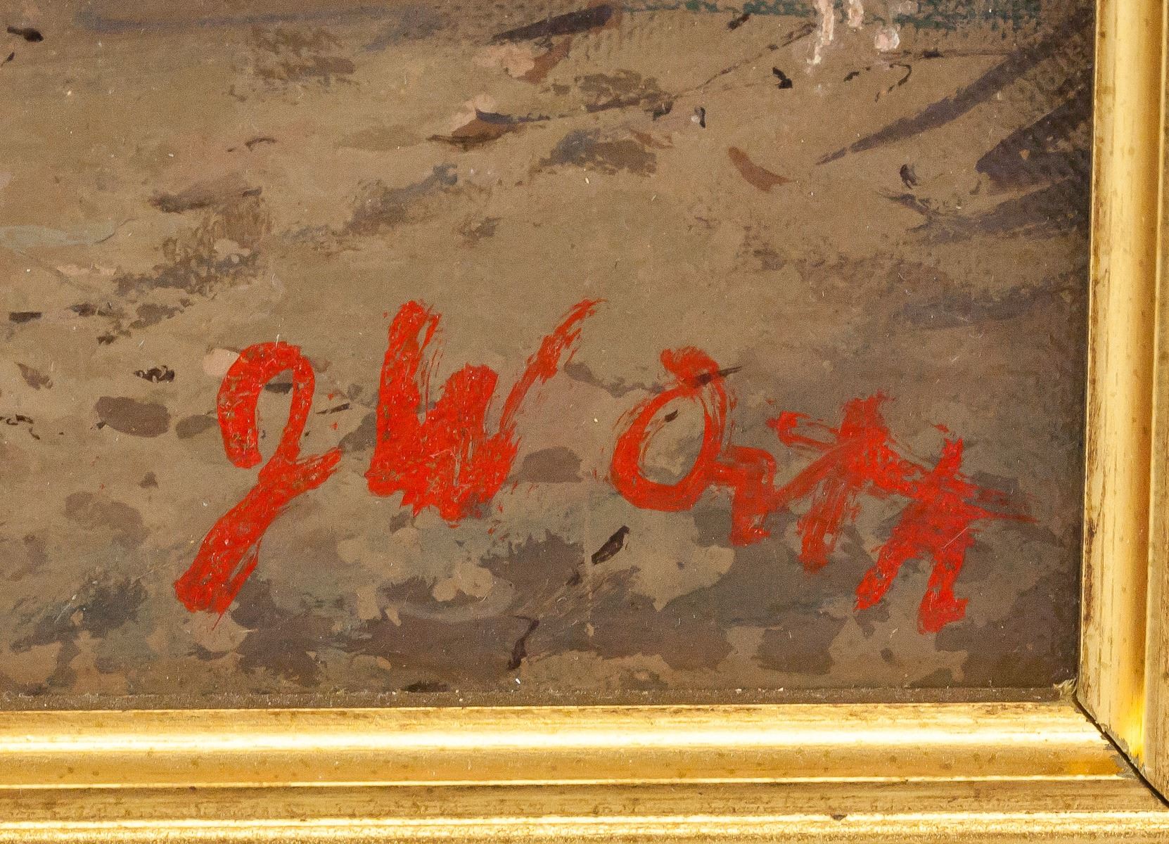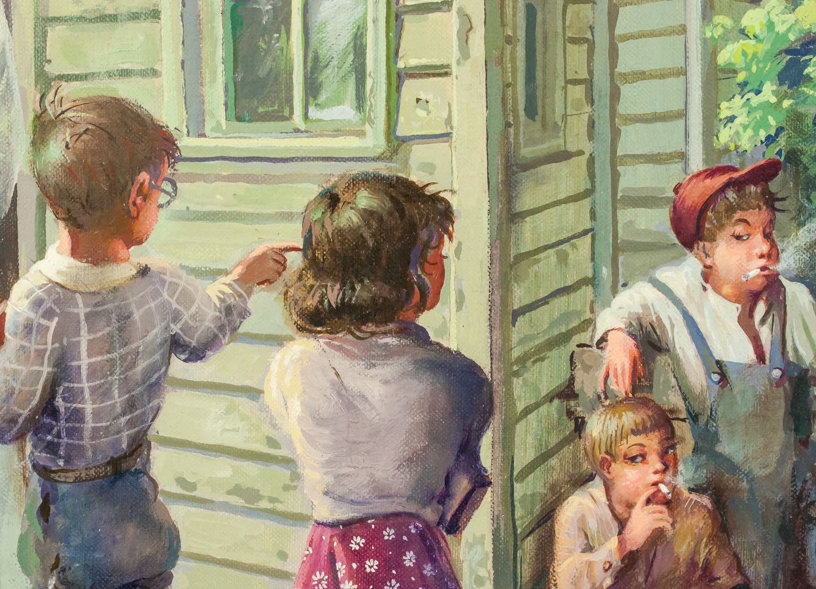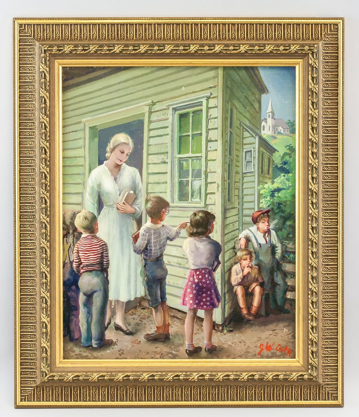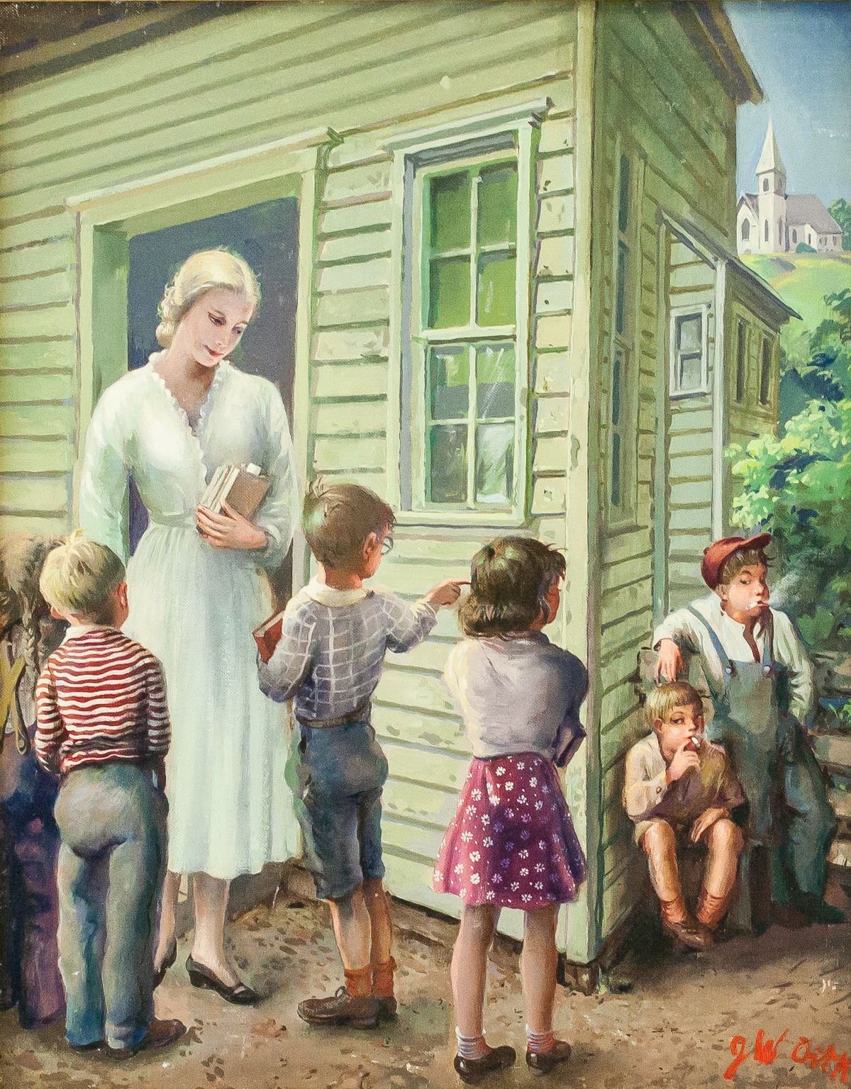 Oil on board, framed. Featuring a group of schoolchildren standing outside with a teacher nearby. Signed "JW Orth" in the bottom right corner. "13547-3" inscribed twice on verso. Attributed to John William Orth (1889-1976, American). 50 x 39 cm (20 x 15 inches), framed: 67 x 54 cm (26 x 21 inches). PROVENANCE: Eden Art Gallery