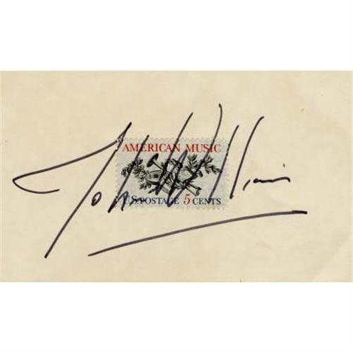 <B>John Williams Autograph.</B></I> A 5" x 3" card, with a five-cent stamp affixed, signed by the Academy Award-winning composer in black ink. Williams' autograph extends across the face of the stamp and is large and clean. In Excellent condition.<BR><BR><b>Shipping:</b> Flat Material, Small (<a target="_blank" href="http://www.heritageauctions.com/common/shipping.php">view shipping information</a>)