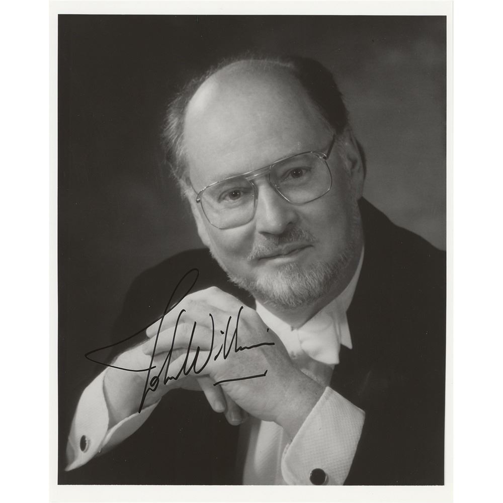 Glossy 8 x 10 photo of John Williams in formal attire, signed in black felt tip by the great composer. In fine condition, with a few small creases.