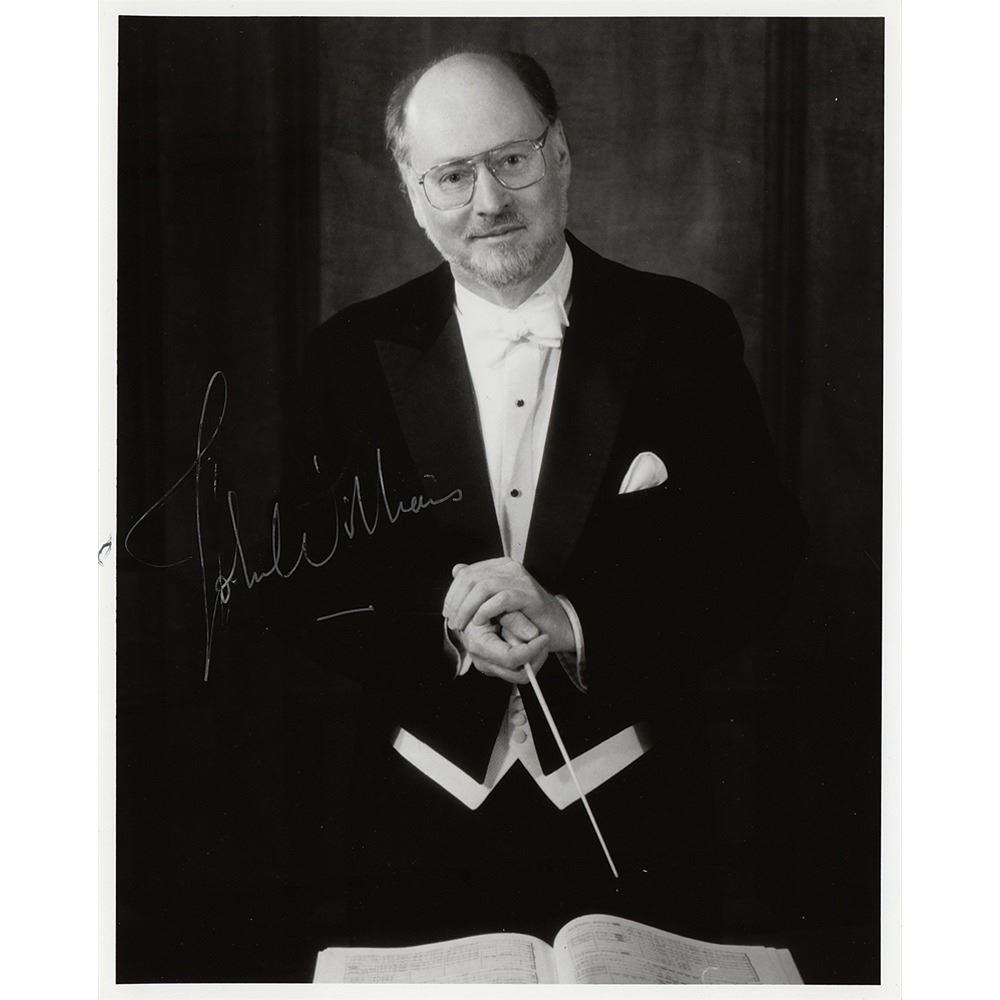 Glossy 8 x 10 photo of John Williams posing in a tuxedo and holding his conductor's baton, signed in silver ink. In very fine condition, with some minor pen trouble to the start of the signature.