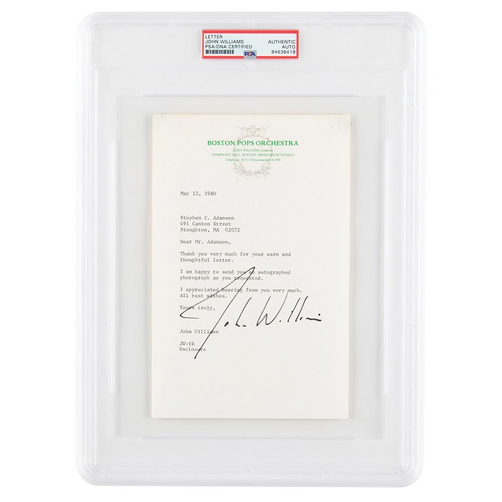 TLS, one page, 5.5 x 8.5, Boston Pops Orchestra letterhead, May 12, 1980. Letter to an autograph collector, in part: "Thank you very much for your warm and thoughtful letter….I appreciated hearing from you very much. All best wishes." In fine condition. Encapsulated in a PSA/DNA authentication holder.