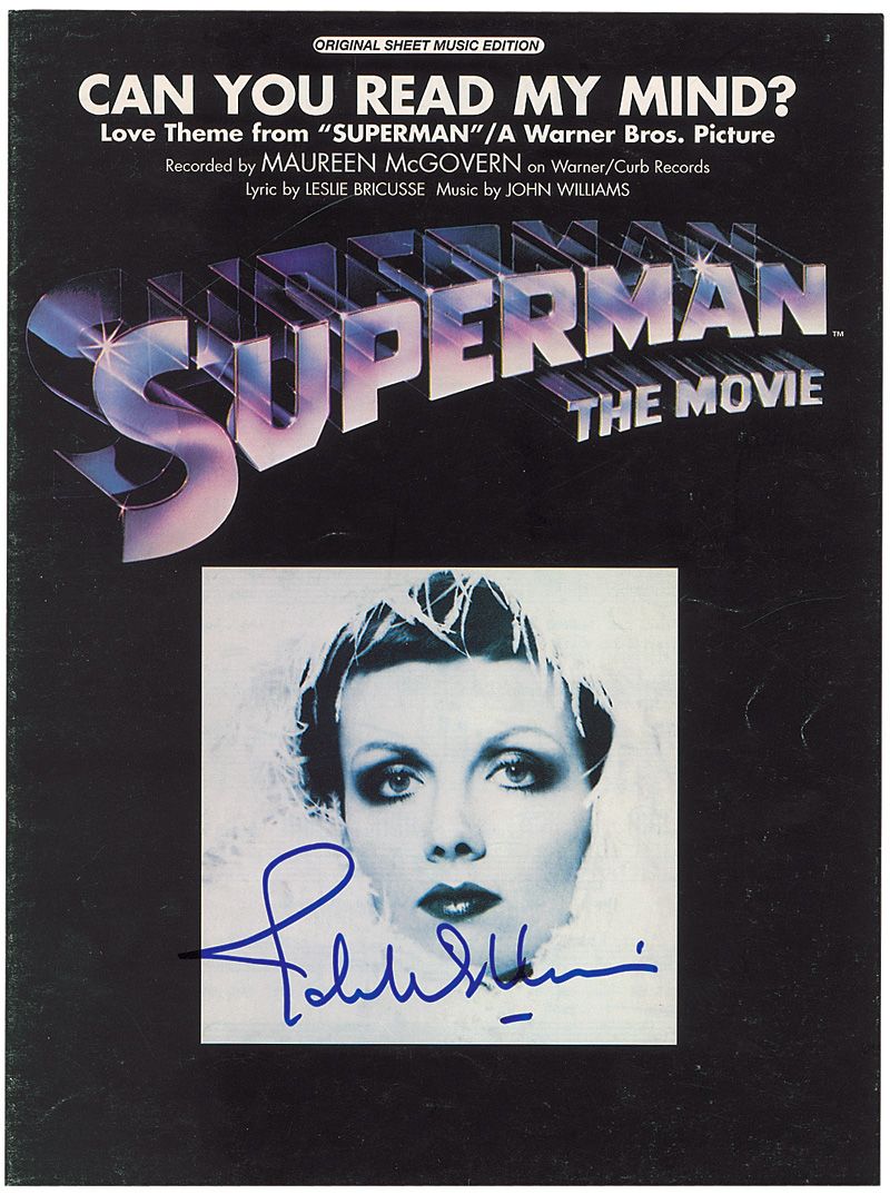 Sheet music to ‘Can You Read My Mind?,’ the Love Theme from Superman, 9 x 12, four pages, signed on the front cover in blue felt tip by Williams. In fine condition, with a few scattered minor creases.