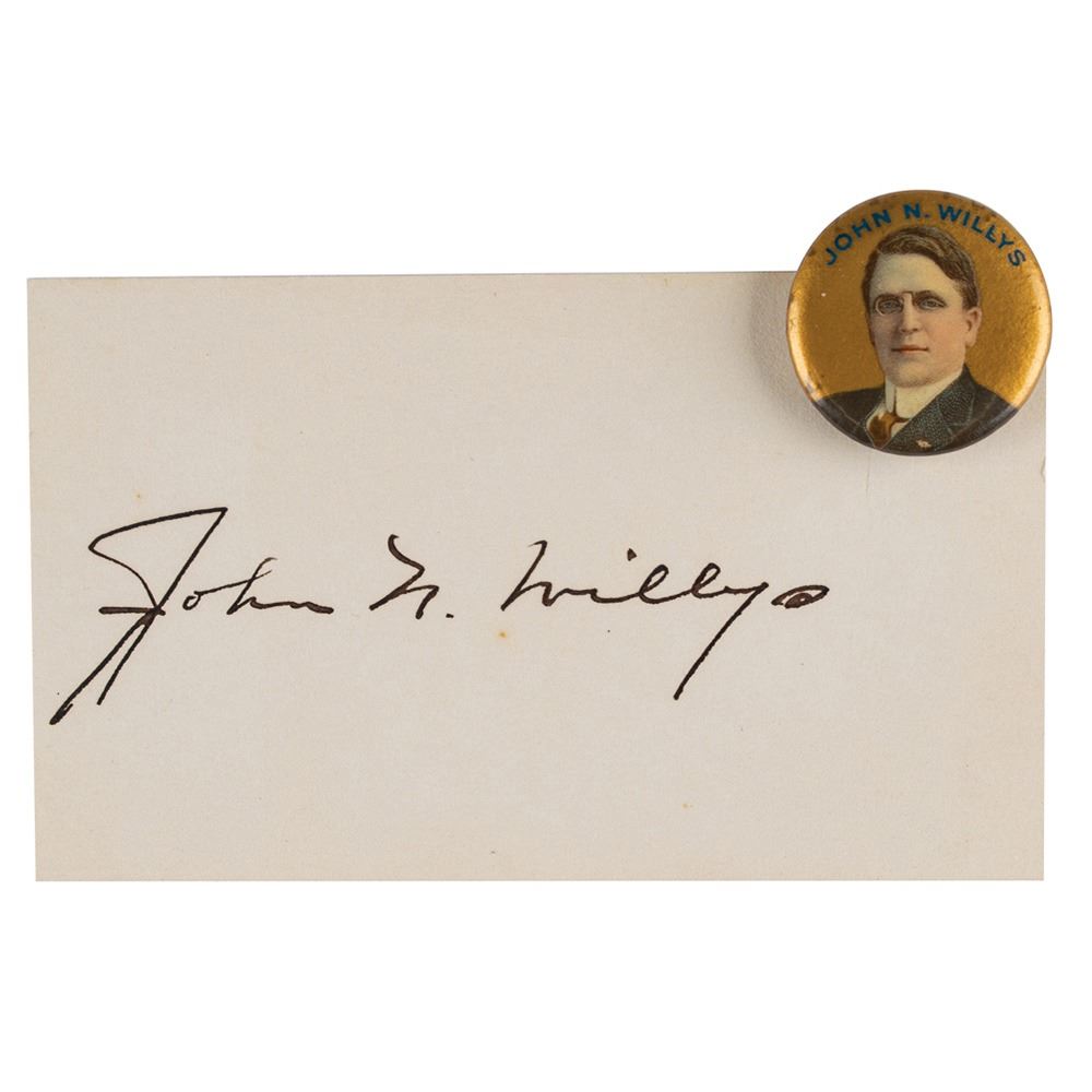 Ink signature, "John N. Willys,” on an off-white 3.75 x 2.25 card. In fine condition. Accompanied by a Bastian Bros. celluloid pinback button depicting Willys.