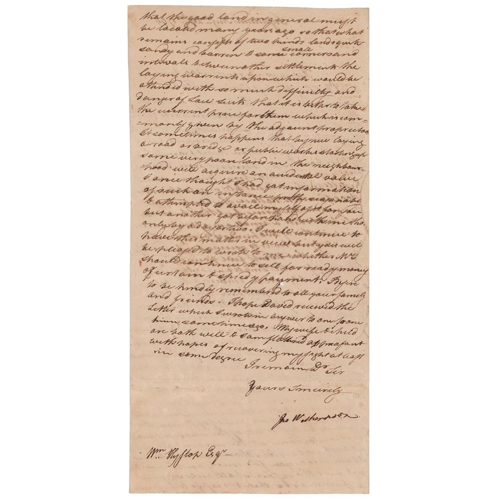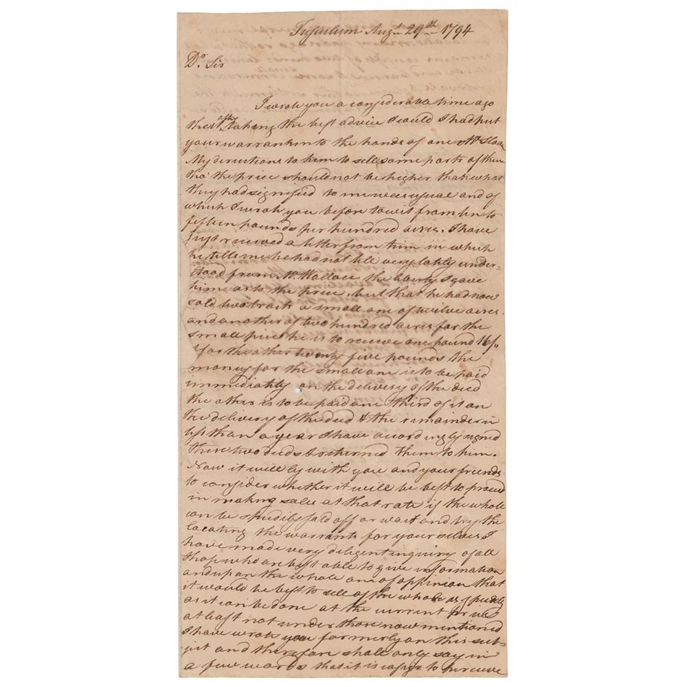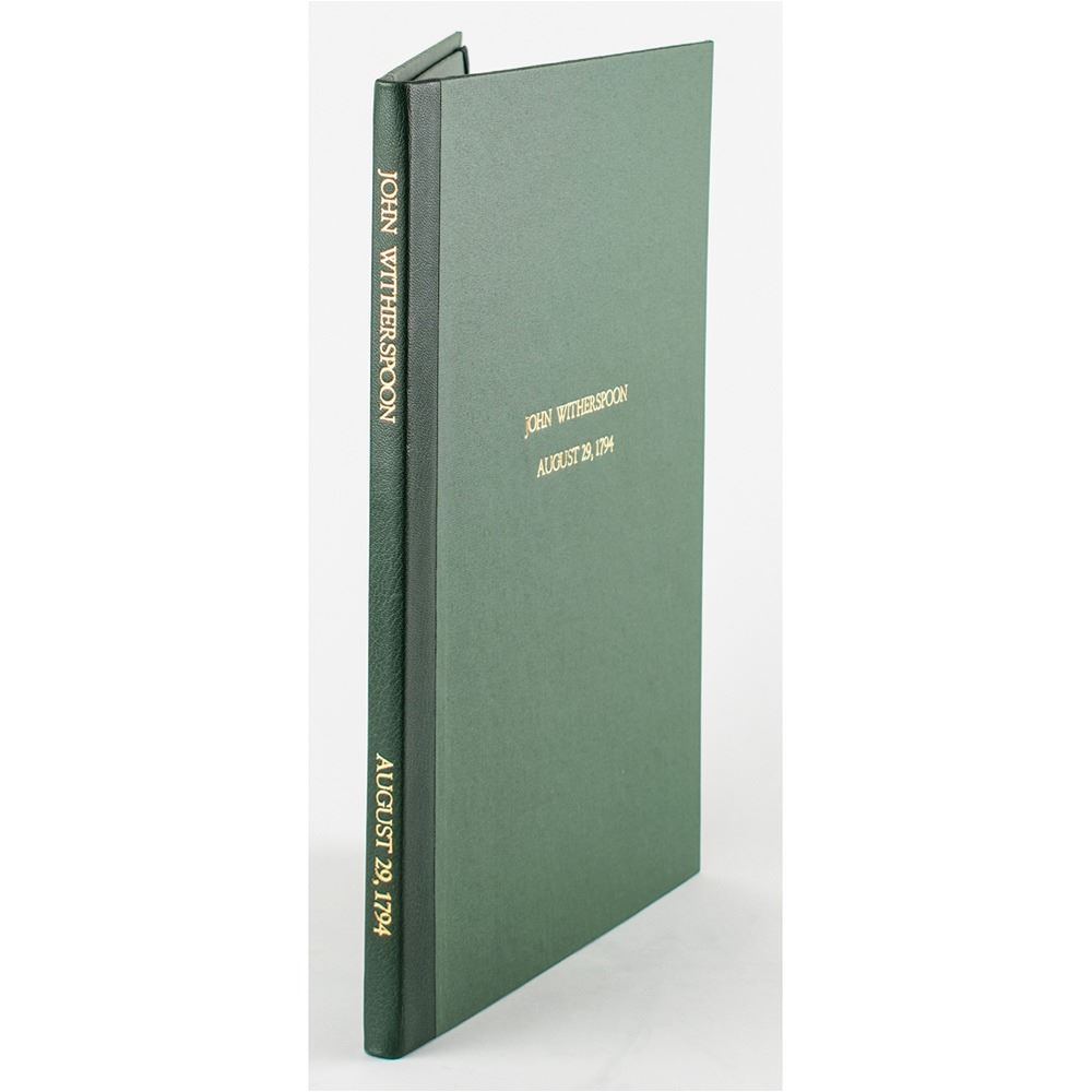 Signer of the Declaration of Independence from New Jersey (1723–1794), who served as an influential president of Princeton University and went on to sign the Articles of Confederation. Rare LS signed “Jno. Witherspoon,†one page both sides, 6 x 12.5, August 29, 1794. Letter concerning some potential real estate transactions toward the end of his life. From his country estate, "Tusculum," outside Princeton, he opines on plots and prices, in part: "I have wrote you formerly on this subject and therefore shall only say in a few words that…the good land in general must be located many years ago so that what remains comprises of two kinds of lands quite sandy and barren & some small corners and intervals between other settlements the laying warrants upon which would be attended with so much difficulty and danger of law suits that it is better to take the warrant price for them which is commonly given by the adjacent proprietors." In fine condition, with professionally repaired paper loss to the left edge. Accompanied by a handsome custom-made finely bound quarter leather case. In his 1995 reference History Comes to Life, Kenneth Rendell places Witherspoon's autograph material into the 'very rare' category among the signers of the Declaration.