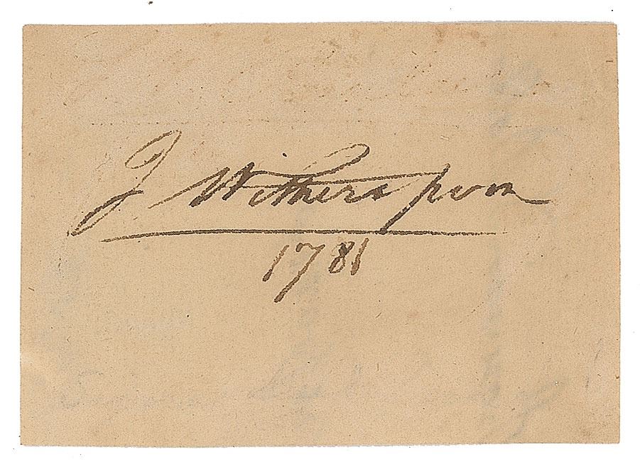 Extremely scarce ink signature, "J. Witherspoon, 1781,” on an off-white 2.75 x 2 slip. In fine condition. In his 1995 reference History Comes to Life, Kenneth Rendell places Witherspoon's autograph material into the 'very rare' category among the signers of the Declaration.