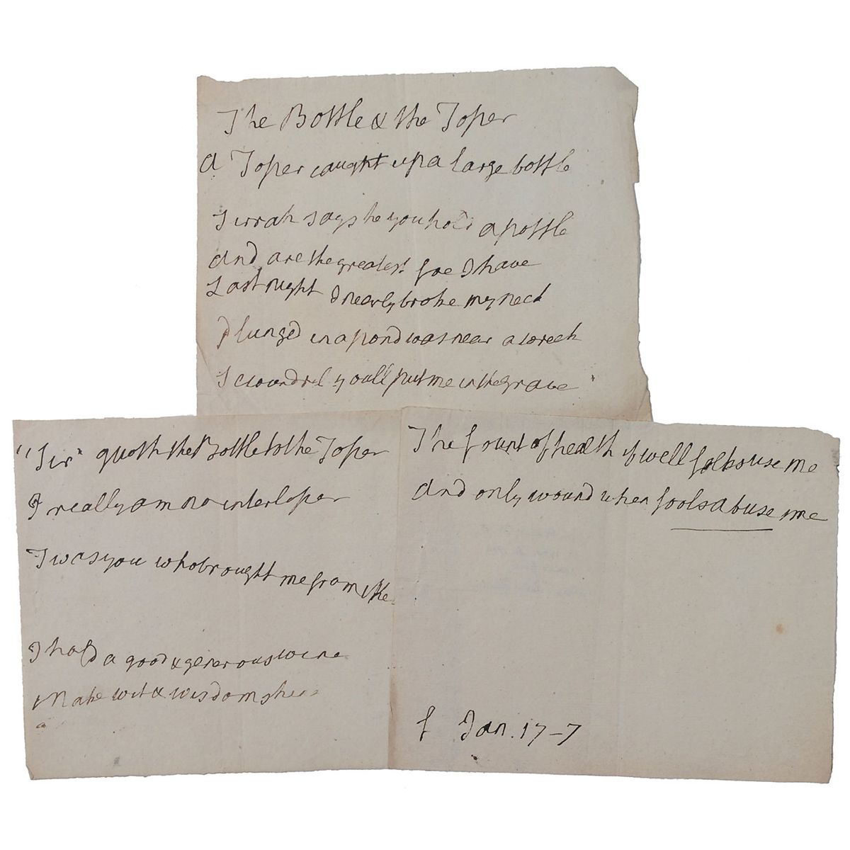 English satirist (1738–1819) who wrote under the pseudonym ‘Peter Pindar.’ Unsigned autograph poem, three pages, 7.25 x 5.75, dated “Jan. 17–7.” Wolcot pens a 13-line poem entitled “The Bottle & The Toper.” In part: “A Toper caught up a large bottle…says he you hold a pottle / and are the greatest foe I have / Last night I nearly broke my neck / plunged in a pond was near a wreck / Scoundrel you'll put me in the grave / 'Sir' Quoth the Bottle to the Toper / I really am no interloper…I hold a good & generous wine / & make wit & wisdom shine / The fount of health if well folks use me / and only wound when folks abuse me.” In fine condition, with a central vertical fold and some light creases.