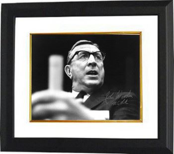 As head coach at UCLA John Wooden won ten NCAA national championships in a 12-year period, seven in a row, an unprecedented feat. Within this period, his teams won a record 88 consecutive games. He was named national coach of the year six times. Wooden was named a member of the Basketball Hall of Fame as a player (inducted in 1961) and as a coach (in 1973), the first person ever enshrined in both categories. John Wooden has hand signed this UCLA Bruins Coaching B&W 8x10 Photo with UCLA inscription. Certificate of Authenticity from Athlon Sports. Custom White Mat and Premium Black Frame as shown.