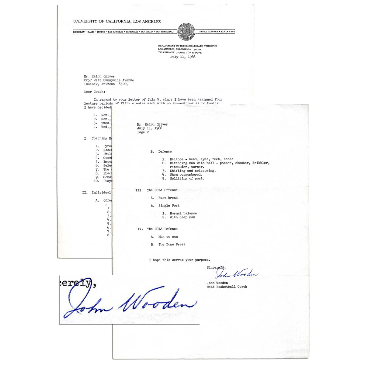 John Wooden typed letter signed, dated 11 July 1966 on UCLA letterhead. The ''Wizard of Westwood,'' UCLA head basketball coach from 1948-75, describes to a Ralph Oliver the topics he has chosen for a speaking engagement. He lists: ''...Coaching Methods and Procedures...Individual Fundamentals...The UCLA Offense...The UCLA Defense...'' The signature in blue ink reads: ''John Wooden''. The two page 8.5'' x 11'' letter is in very good condition.