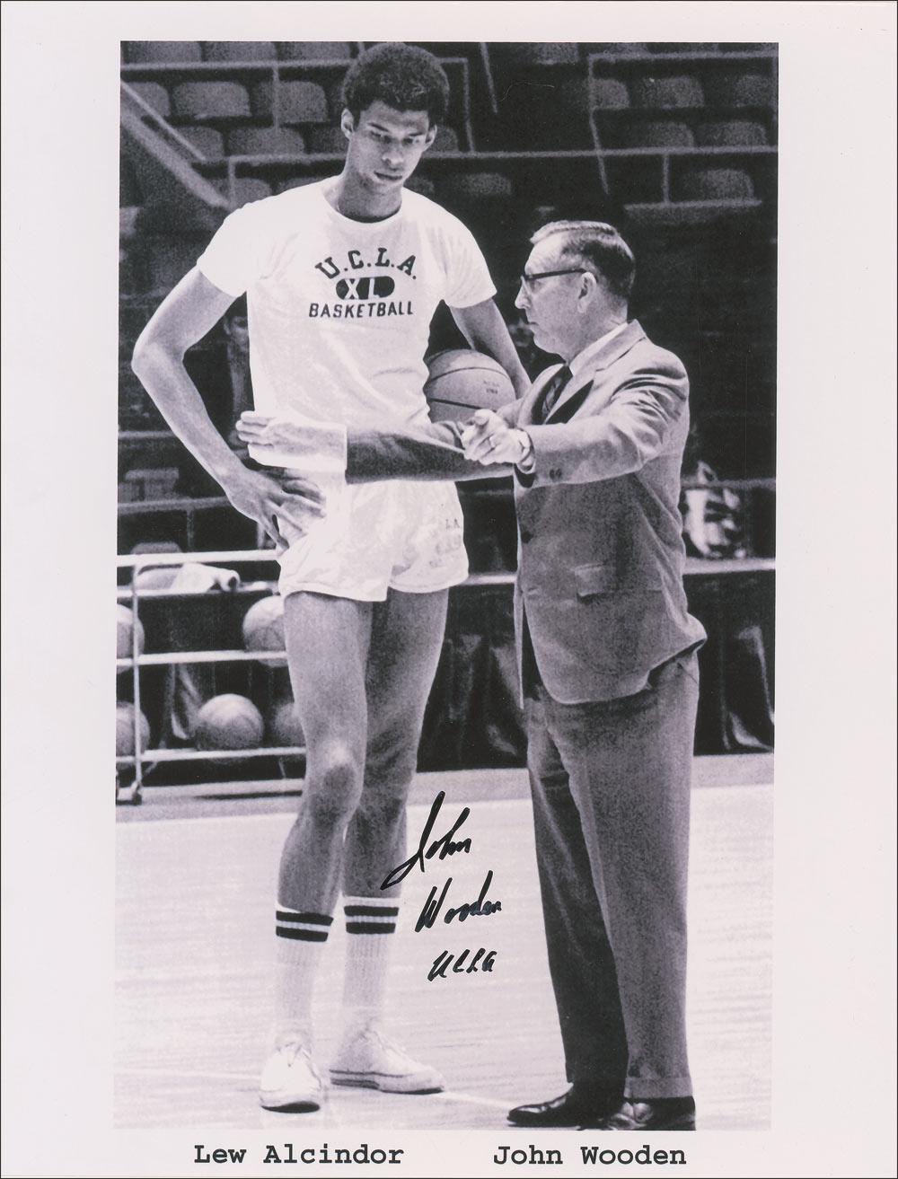 Glossy 11 x 14 photo of Wooden coaching Lew Alcindor, signed in black felt tip, “John Wooden UCLA.” In fine condition, with some light creases along top edge.