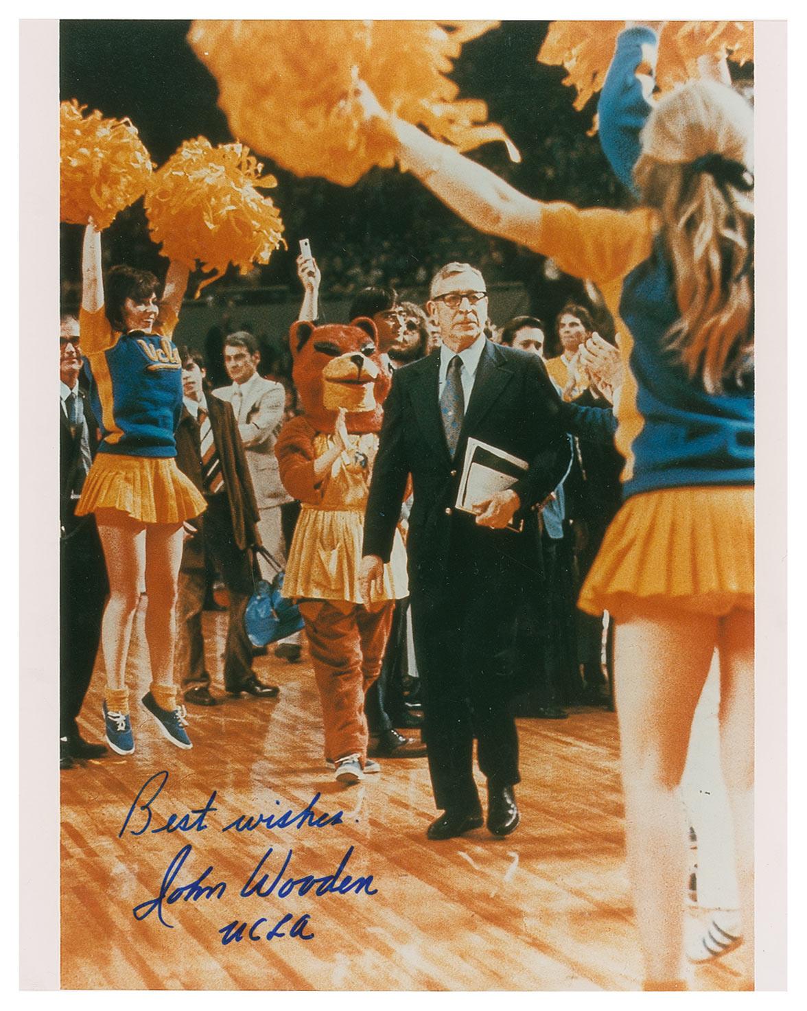 Color glossy 8 x 10 photo of Wooden on the court during a game, signed in blue felt tip “Best wishes, John Wooden, UCLA.” In fine condition.