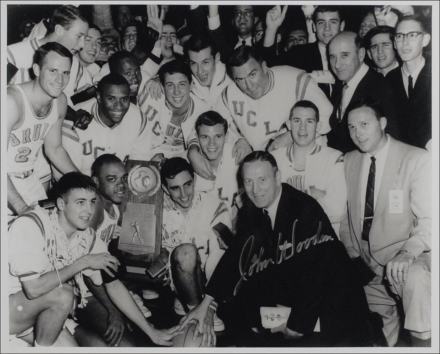 Glossy 20 x 16 photo of Wooden posing with one of his UCLA NCAA national basketball championship teams, signed in silver ink. In very fine condition.