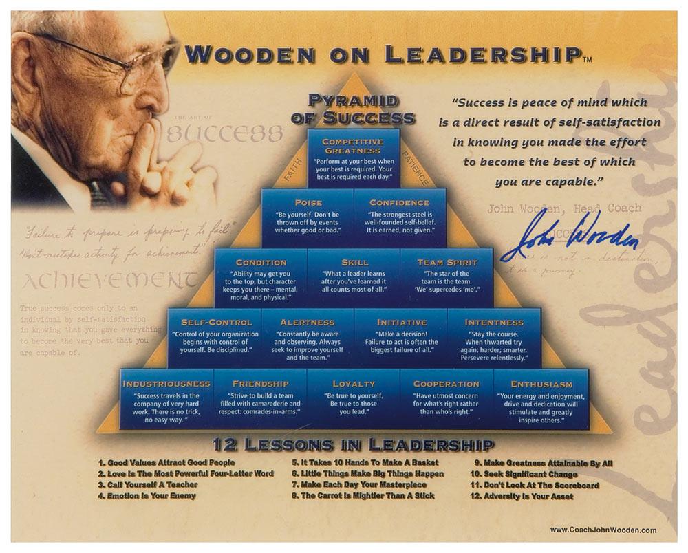 Color satin-finish 10 x 8 composite photo of Wooden’s ‘Pyramid of Success,’ signed in blue felt tip. In very fine condition.