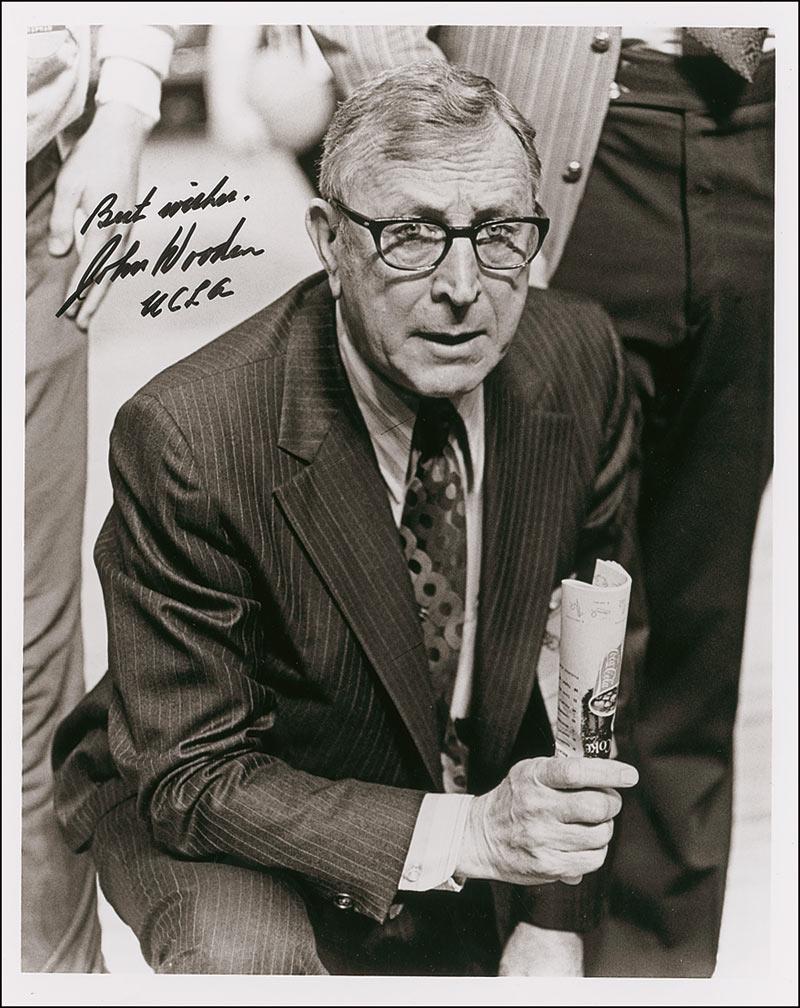 Glossy 8 x 10 photo of Wooden crouched by the sidelines, signed, “Best Wishes, John Wooden, UCLA,” in black felt tip. In very fine condition.