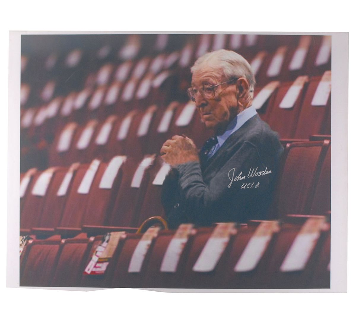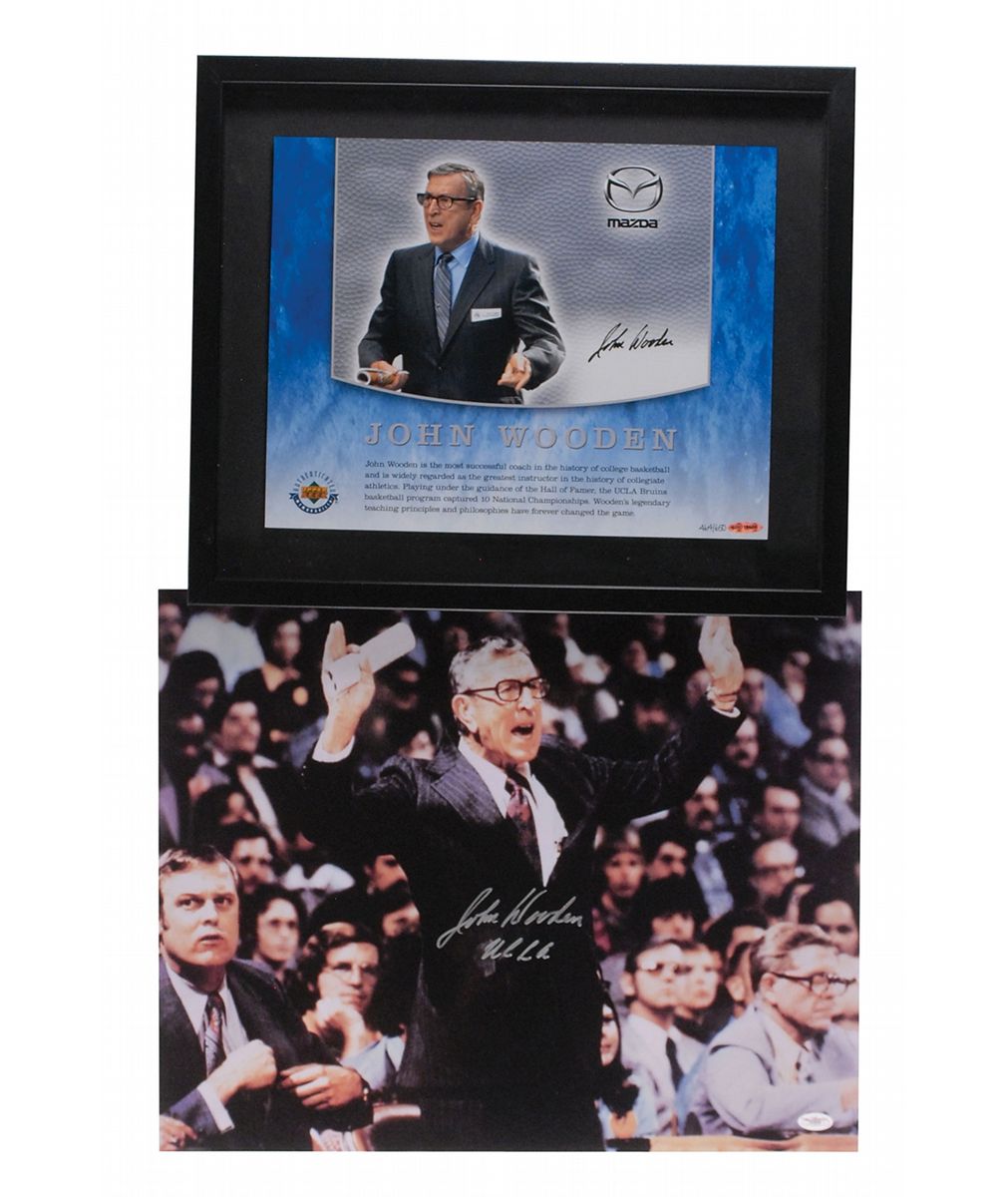 Three items: limited edition Upper Deck color 13.5 x 11 cardstock photo, numbered 464/650, signed in black felt tip. Framed to an overall size of 18.25 x 15.25; color glossy 20 x 16 photo of an animated Wooden in front of the UCLA bench, signed in silver ink, “John Wooden UCLA”; and a color 36 x 27 canvas print of Wooden alone in the stands at Pauley Pavillion, signed in silver ink, “John Wooden UCLA,” and rolled. In fine condition.