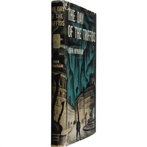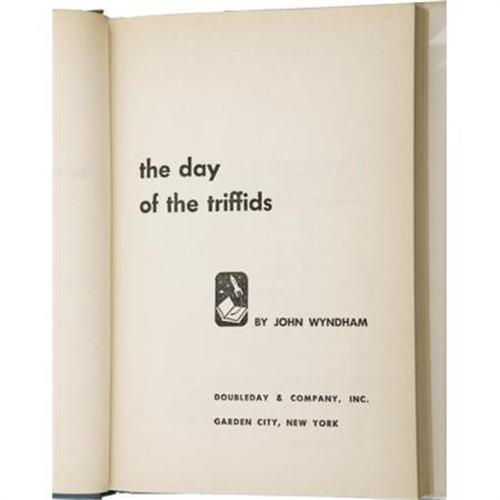 <B>John Wyndham: <I>The Day of the Triffids</B></I></B></I> (New York: Doubleday & Company, Inc., 1951), first edition, 222 pages, jacket design by Whitney Bender, gray cloth with yellow titles, 8vo (5.5" x 8.25"), dust jacket. Book is in very good condition, with minimal shelf wear. The about very good price-clipped dust jacket has small chips to spine & closed tears to both panels.<BR><BR><b>Shipping:</b> Books & Catalogs (<a target="_blank" href="http://www.heritageauctions.com/common/shipping.php">view shipping information</a>)