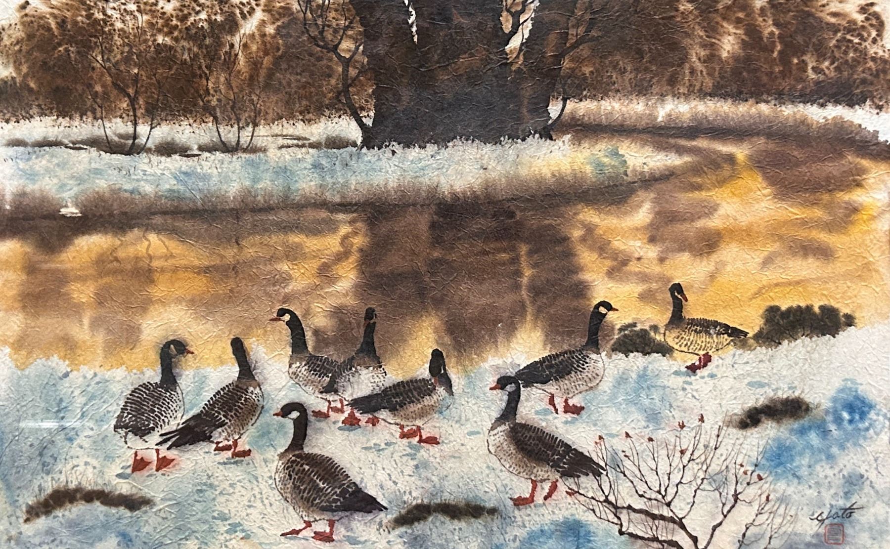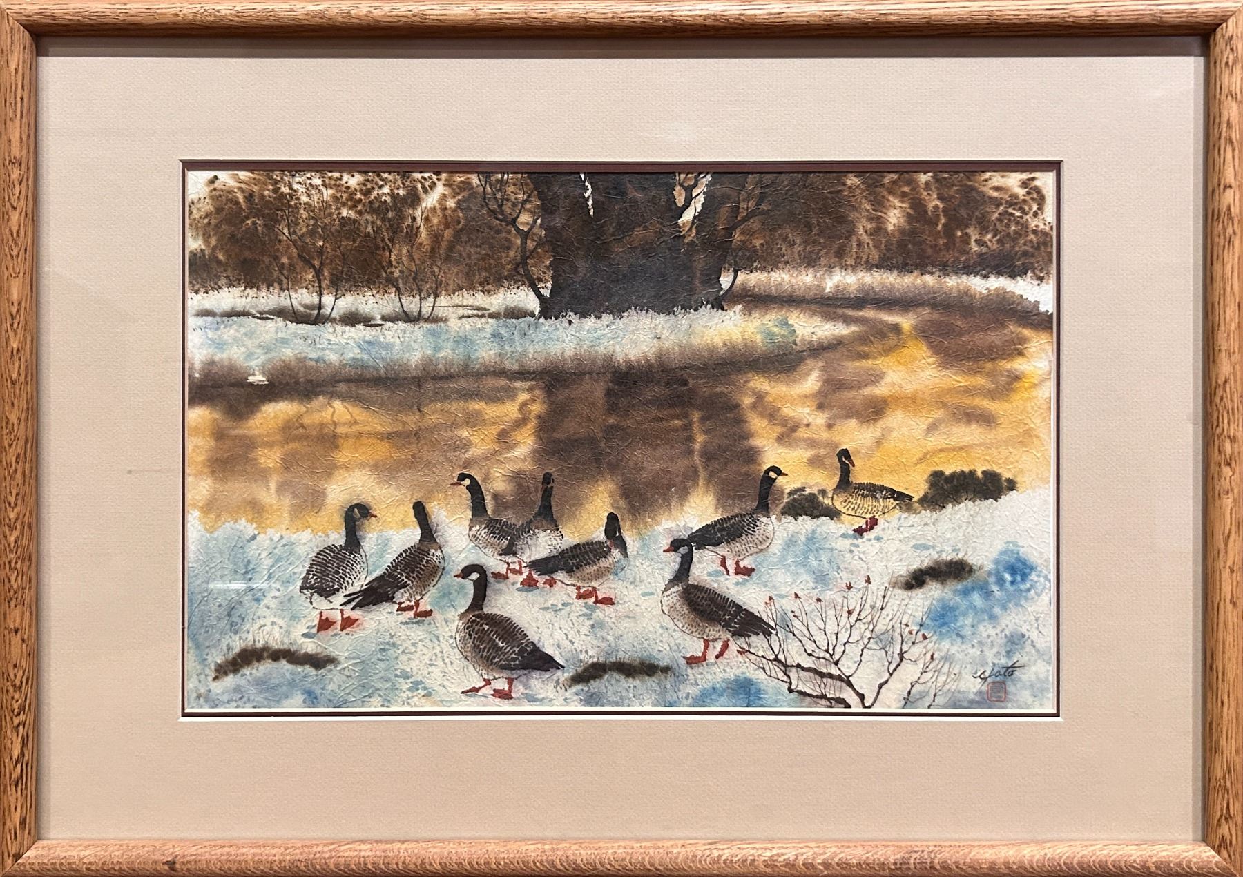 John Yato (b. 1950) "Geese" Watercolor on tissue paper