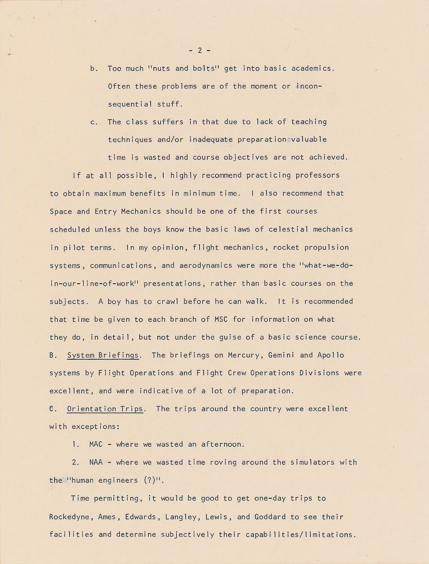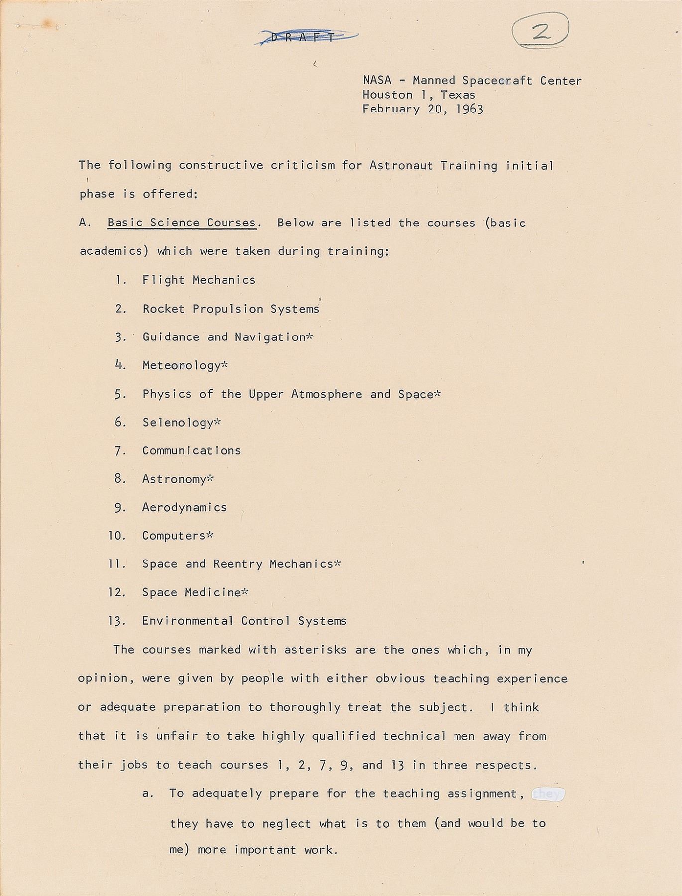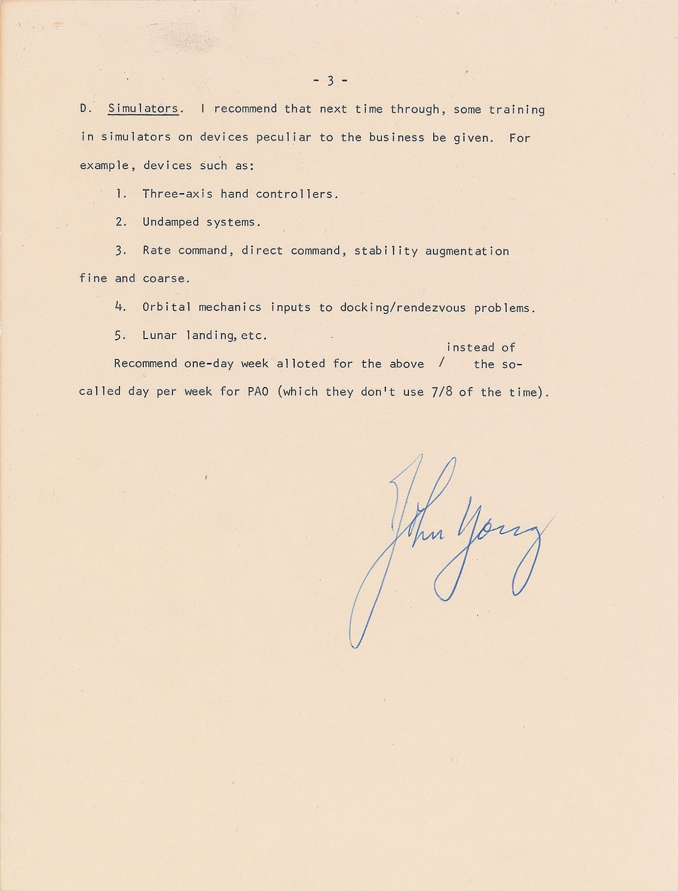 Typed memo, signed "John Young," three pages, 8 x 10.5, February 20, 1963. A memorandum issued to Major Deke Slayton, offering "constructive criticism for Astronaut Training initial phase." Young lists all courses and marks with asterisks those which "were given by people with either obvious teaching experience or adequate preparation to thoroughly treat the subject…If at all possible, I highly recommend practicing professors to obtain maximum benefits in minimum time. I also recommend that Space and Entry Mechanics should be one of the first courses scheduled unless the boys know the basic laws of celestial mechanics in pilot terms. In my opinion, flight mechanics, rocket propulsion systems, communications, and aerodynamics were more the 'what-we-do-in-our-line-of-work' presentations, rather than basic courses on the subjects. A boy has to crawl before he can walk…I recommend that next time through, some training in simulators on devices peculiar to the business be given. For example, devices such as " 1. Three-axis hand controllers. 2. Undamped systems. 3. Rate command, direct command, stability augmentation fine and coarse. 4. Orbital mechanics inputs to docking/rendezvous problems. 5. Lunar landing, etc." In fine condition, with staple holes to upper left. Young had been selected as part of the Group 2 Astronauts in September 1962, and in this critique offers his thoughts on the introductory academic courses the men took between October 1962 and February 1963. Young would be the first of his cohort—nicknamed 'The New Nine'—to travel into space, piloting the 'Molly Brown' on Gemini 3, the first manned flight of the Gemini program.