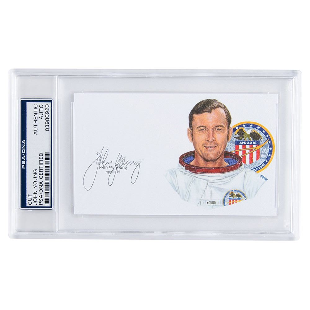 Pencil signature, "John Young,” on a white 5 x 3 card imprinted with his name and an artist's portrait of the moonwalker with the Apollo 16 emblem. In very fine condition. Encapsulated in a PSA/DNA authentication holder.