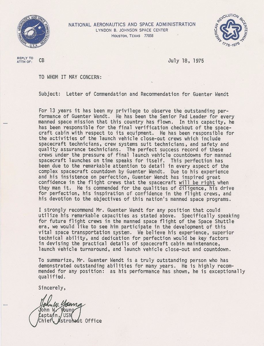 TLS signed “John W. Young,” one page, 8 x 10.5, NASA letterhead, July 18, 1975. Letter of recommendation for Guenter Wendt, in part: “For 13 years it has been my privilege to observe the outstanding performance of Guenter Wendt. He has been the Senior Pad Leader for every manned space mission that this country has flown…He has been responsible for the activities of the launch vehicle close-out crews which include spacecraft technicians, crew systems suit technicians, and safety and quality assurance technicians. The perfect success record of these crews under the pressure of final launch vehicle countdowns for manned spacecraft launches on time speaks for itself. This perfection has been due to the remarkable attention to detail in every aspect of the complex spacecraft countdown by Guenter Wendt.” In fine condition. The Guenter Wendt Collection, ex. Ken Havekotte.