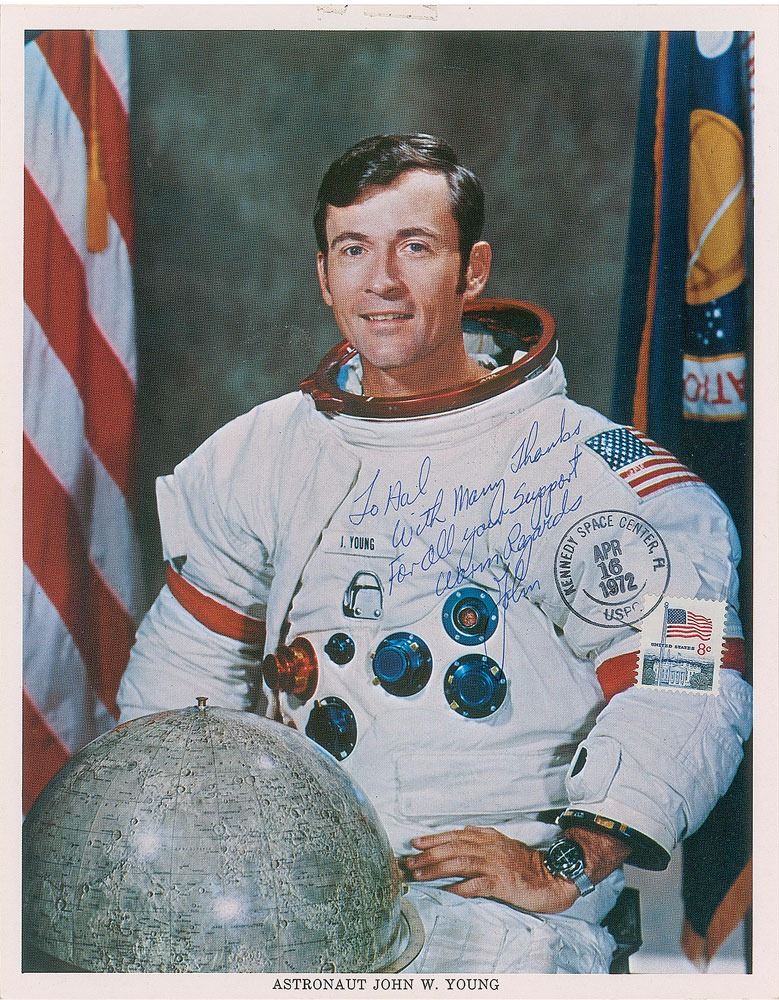 Sought-after color 8 x 10 NASA lithograph of Young in his white space suit, signed and inscribed in blue ballpoint to NASA Chief of Mission Support Harold 'Hal' Collins, "To Hal, With many thanks for all your support, Warm regards, John.” Affixed next to the signature is an 8-cent postage stamp with April 16, 1972, Kennedy Space Center postal cancellation. In fine condition, with tape remnants to top edge and reverse. Young is scarce in white space suit lithographs, especially earlier examples such as this.