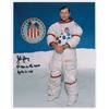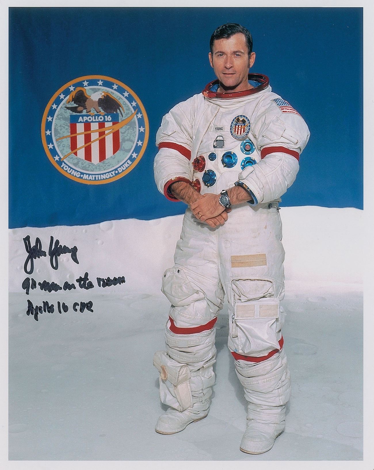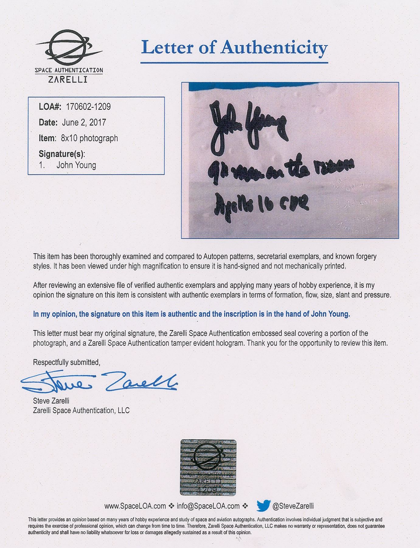 Color satin-finish 8 x 10 photo of Young posing in his white space suit with the Apollo 16 insignia in the background, signed in black felt tip, "John Young, 9th man on the moon, Apollo 16 CDR." In very fine condition. Accompanied by a full letter of authenticity from Zarelli Space Authentication.