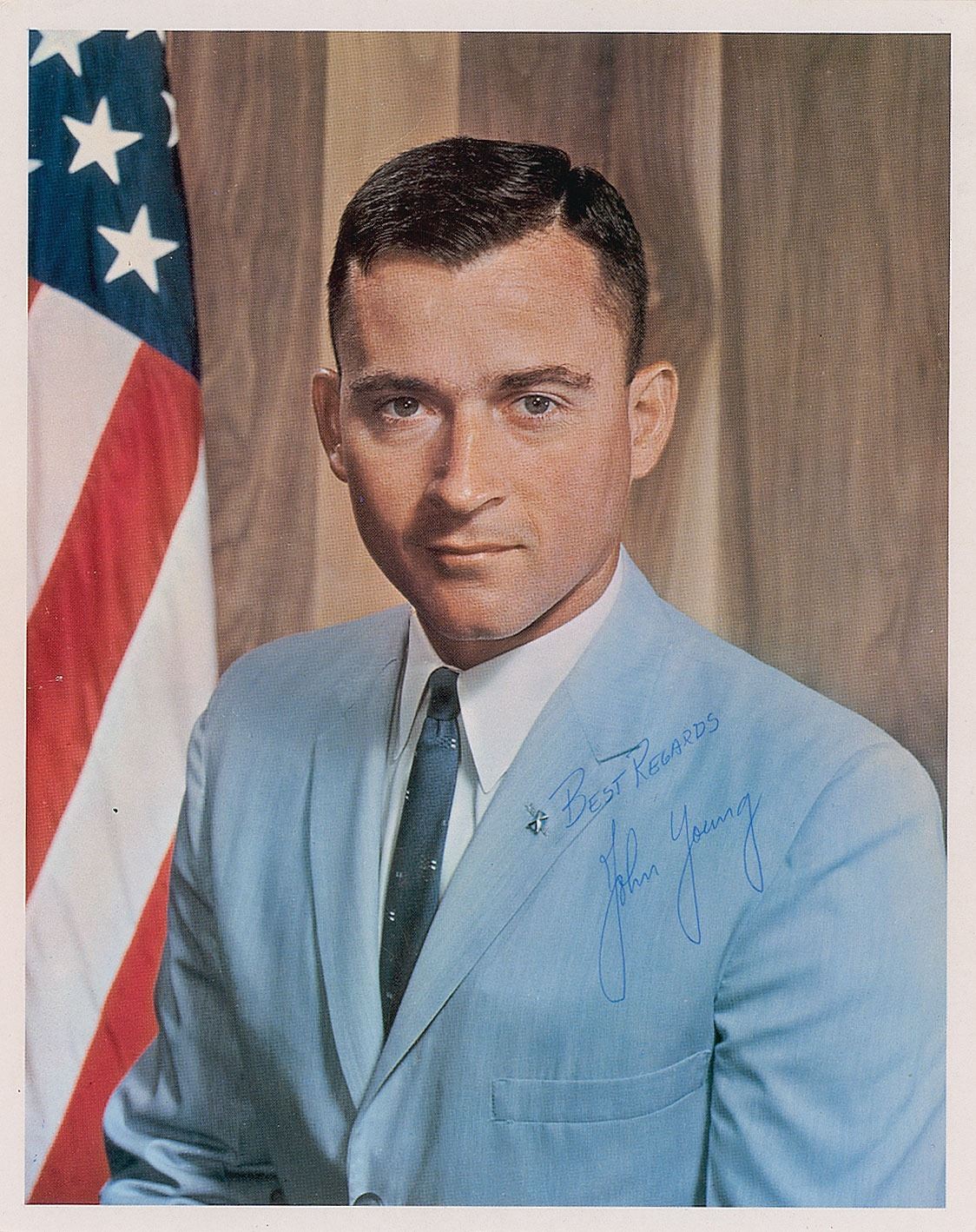 Official color 8 x 10 NASA lithograph of John Young in a formal pose, signed in blue ballpoint, "Best regards, John Young." In very good to fine condition, with a horizontal bend lightly running through the signature and another crease above Young's head.