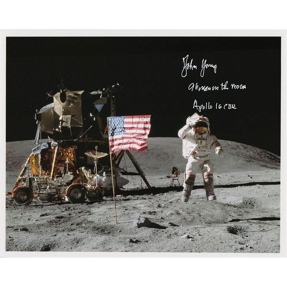 Color satin-finish 10 x 8 photo of Young leaping off the lunar surface and saluting the American flag, signed in white ink, "John Young, 9th Man on the Moon, Apollo 16 CDR." In very fine condition.