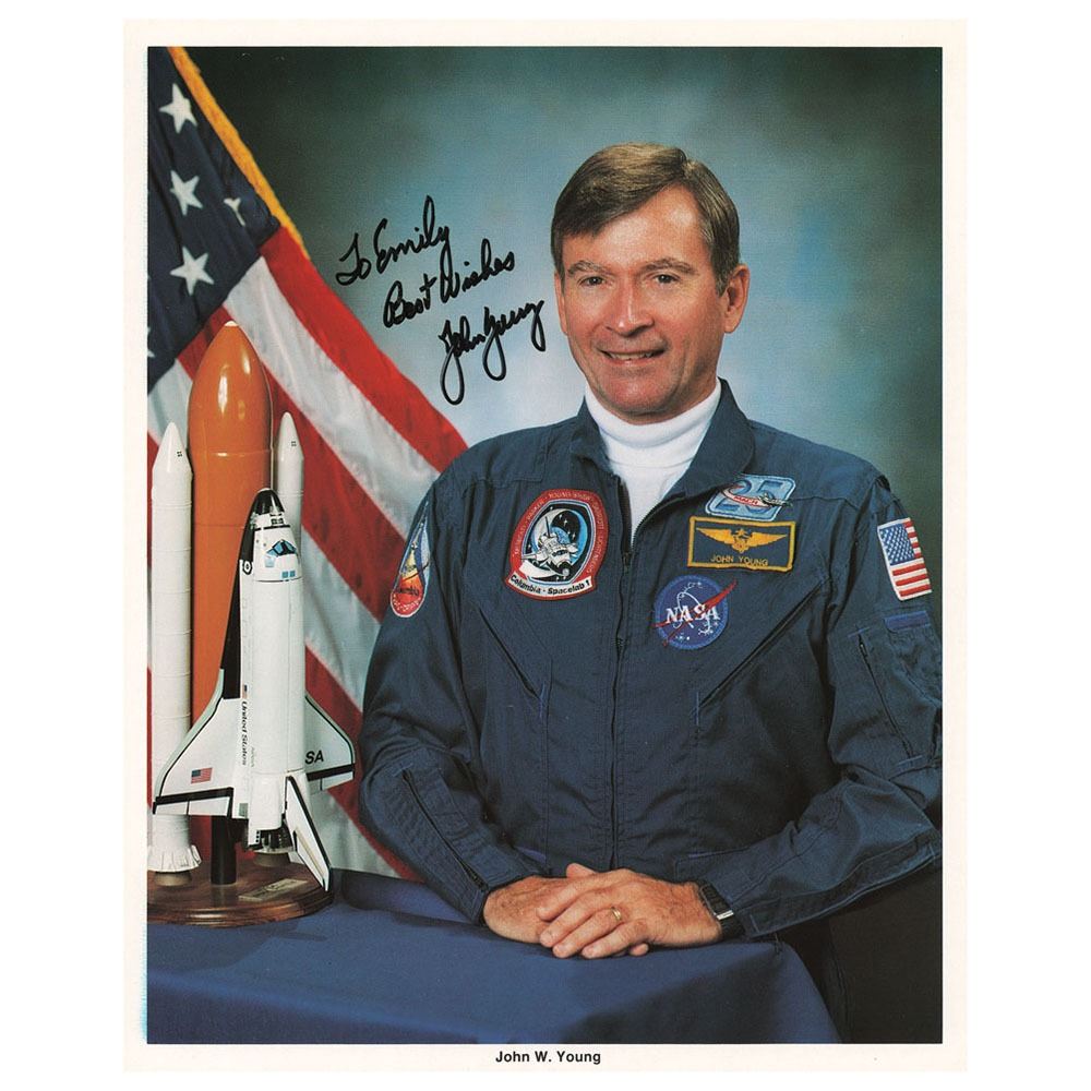 Official color 8 x 10 NASA lithograph of Young in his blue Space Shuttle flight suit, signed and inscribed in black felt tip, "To Emily, Best wishes, John Young.‰Û In very good to fine condition, with a vertical bend, and a few small surface creases.